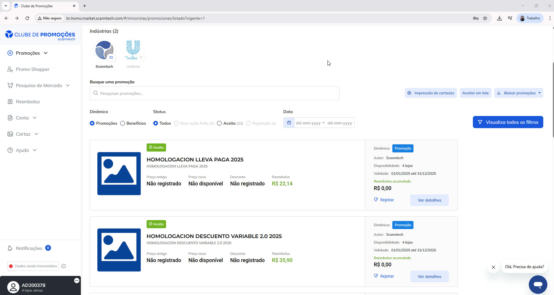 As promoções criadas pelas indústrias ficam disponíveis na plataforma Clube de Promoções Scanntech. Para participar, o cliente deve acessar essa plataforma com seus dados de login, identificar e analisar quais promoções deseja aceitar. Somente dessa forma o lojista consegue selecionar as campanhas que deseja ativar para sua loja. Observe a seguir a página da Scannteh autenticada: