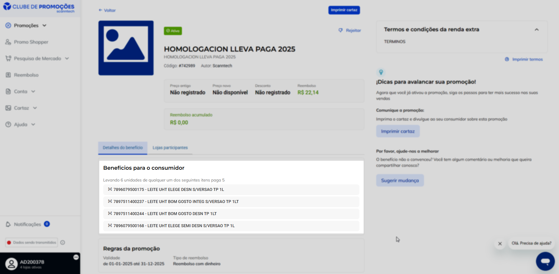 Para que a promoção seja reconhecida corretamente, os códigos de barras (EAN) dos produtos cadastrados na loja devem ser idênticos aos registrados na base da Scanntech. Caso haja divergência, o desconto não será aplicado. Ao detalhar uma promoção no site da Scanntech, é possível identificar o tipo da promoção e os códigos de barras aceitos para ela. Veja o exemplo a seguir: