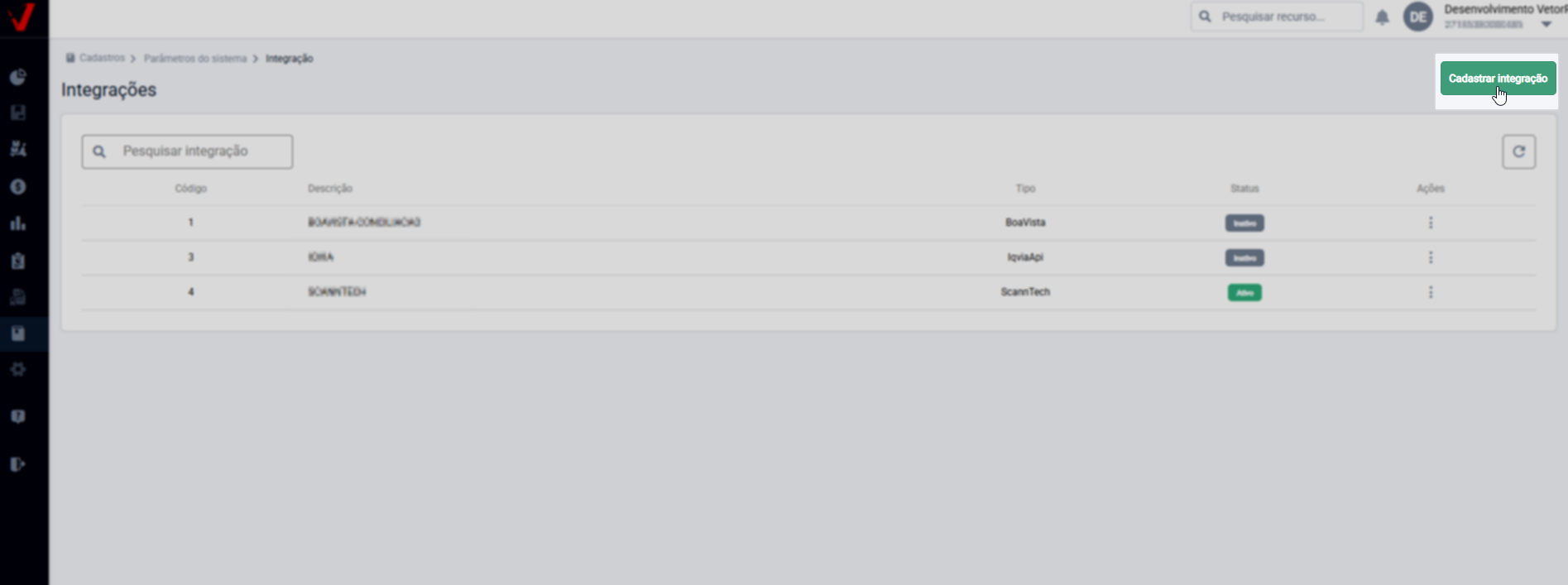 No módulo Vetor Web, acesse o menu Cadastros >> Parâmetros do Sistema >> Integração. Como se trata de uma nova integração, clique em >> Cadastrar Integração: