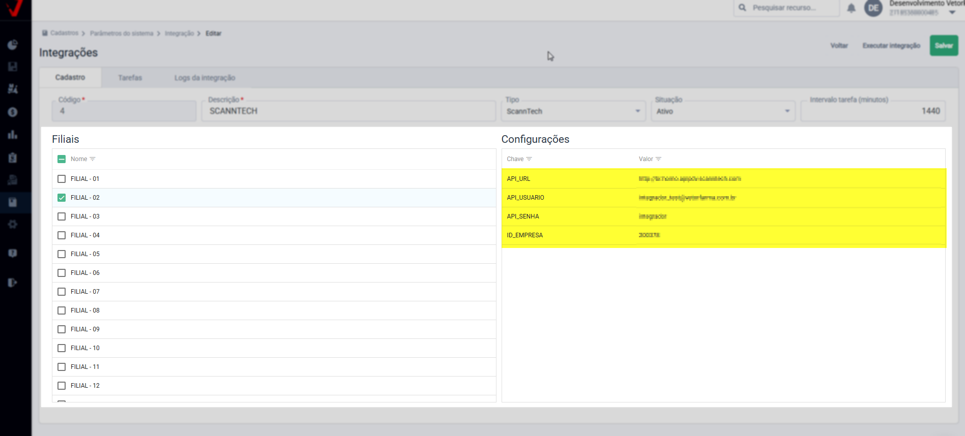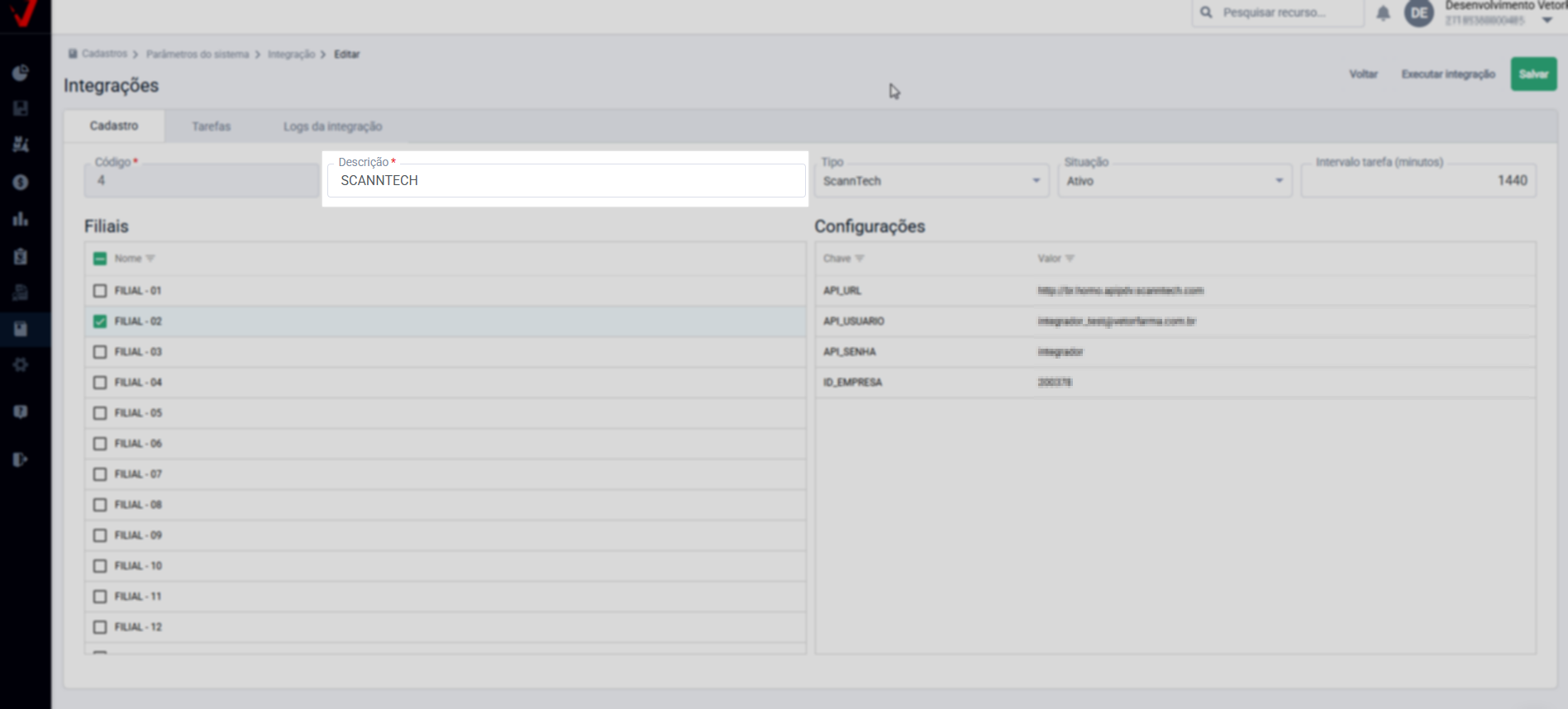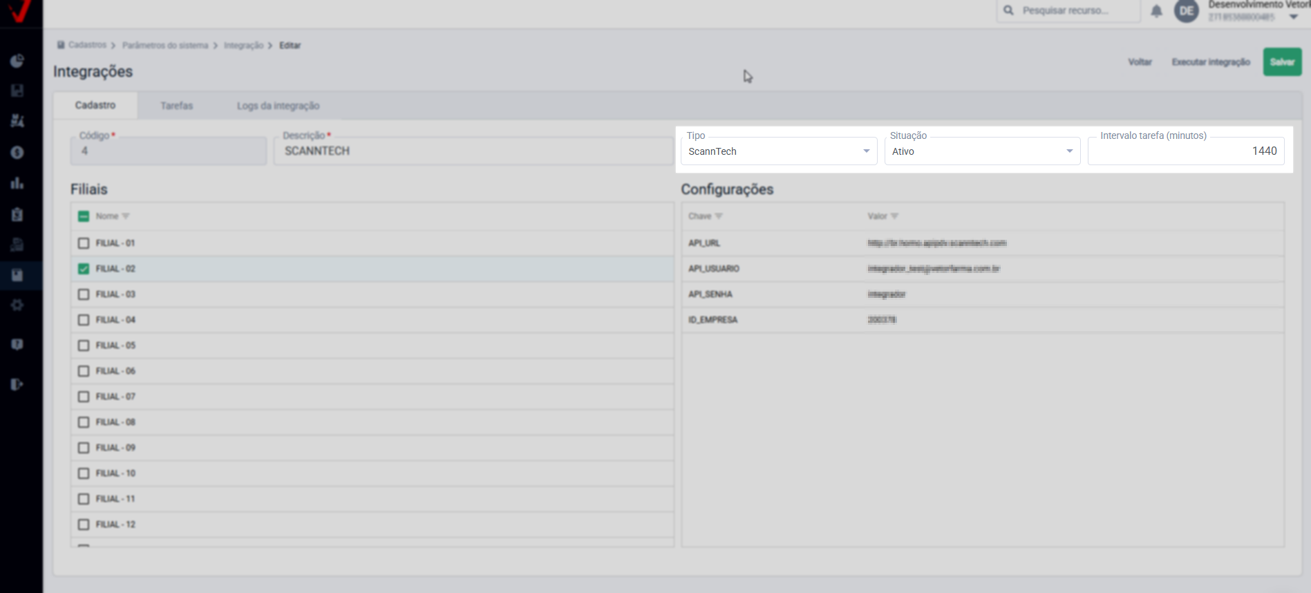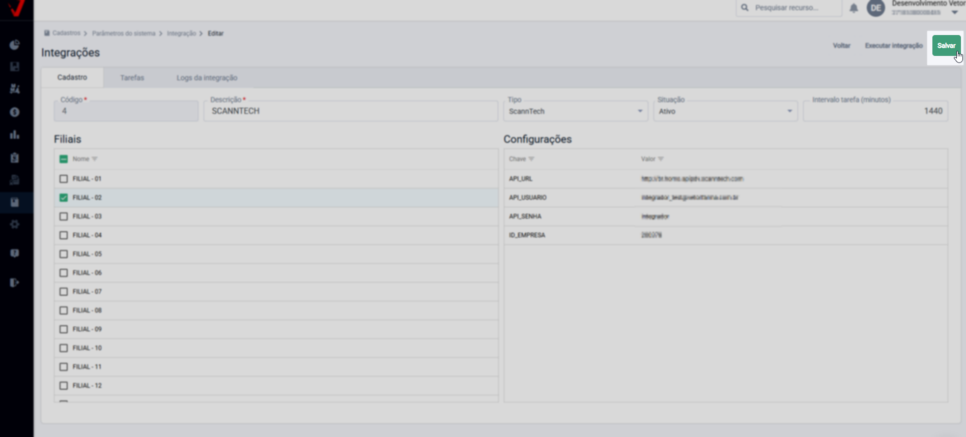 Após, na seção "Filiais", marque as lojas que serão integradas à Scanntech, já em "Configurações" ao lado direito, preencha os campos de acordo com as informações fornecidas pela Scanntech no momento da contratação (informações coletadas para integração):