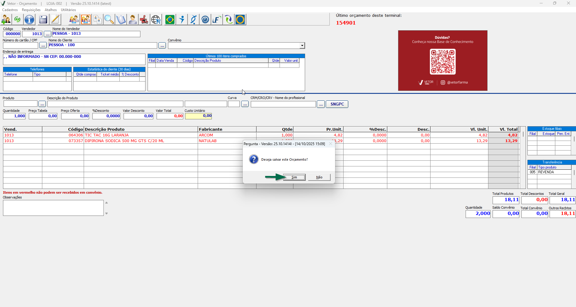 No módulo Orçamento, após informar o vendedor e, conforme o interesse, o cliente, insira normalmente os produtos que fazem parte da promoção e finalize o registro pressionando F2 para gravar.