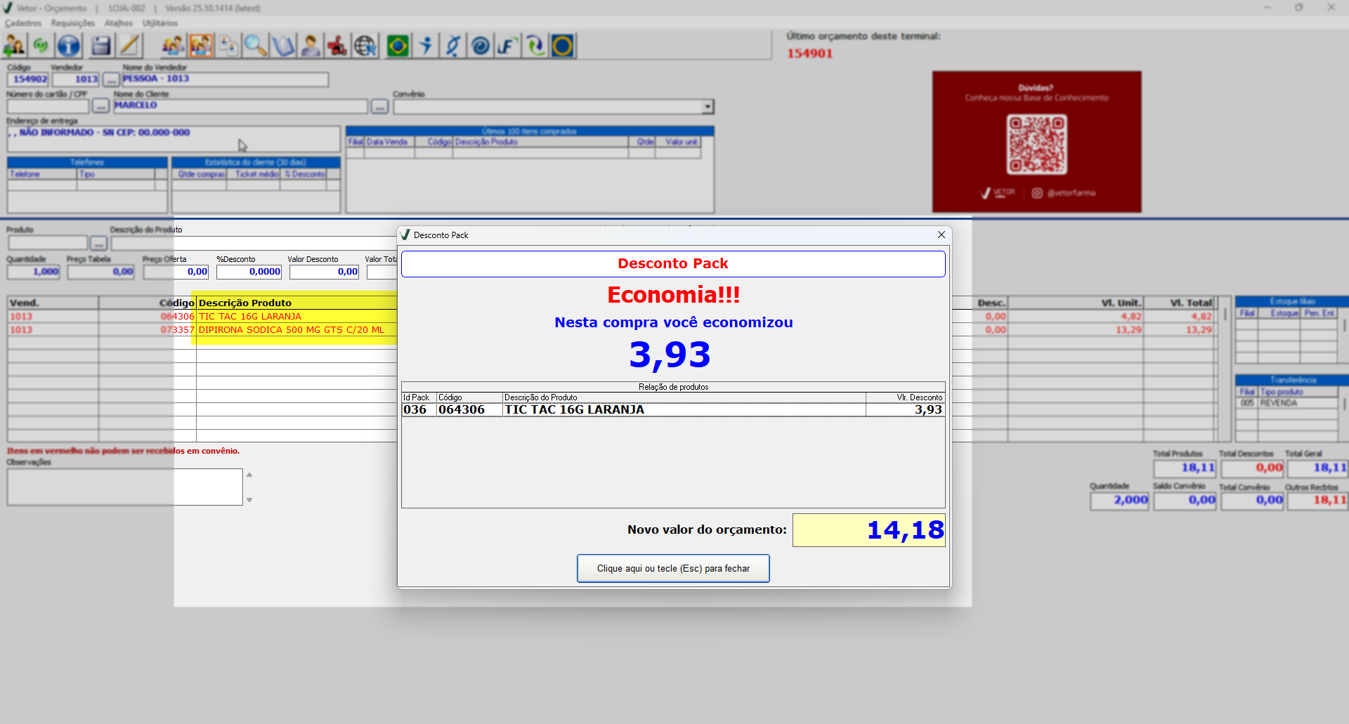 Após a gravação, o sistema realiza automaticamente a análise dos itens inseridos e, caso identifique produtos que atendam aos critérios de alguma promoção ativa na integração, exibirá a tela “Desconto Pack”. Nessa tela, o usuário pode visualizar um breve resumo detalhando o valor total do desconto concedido, os produtos selecionados participantes da campanha e o novo valor total do orçamento já com o desconto aplicado. Observe, na imagem a seguir, que apenas um dos itens foi elegível para a aplicação do desconto, conforme as regras da promoção.