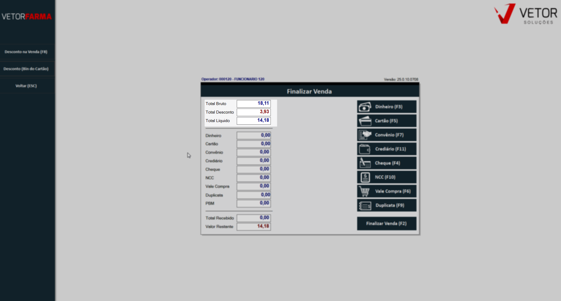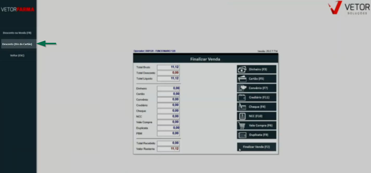 Nesses casos, a finalização da venda segue um procedimento diferenciado. No PDV, considerando que a venda foi identificada e o operador está na tela de finalização, é necessário acionar o recurso BIN antes de informar o recebimento. Para isso, deve-se acessar o menu lateral “Desconto (BIN do cartão)” e realizar a leitura ou digitação do BIN diretamente no pinpad.