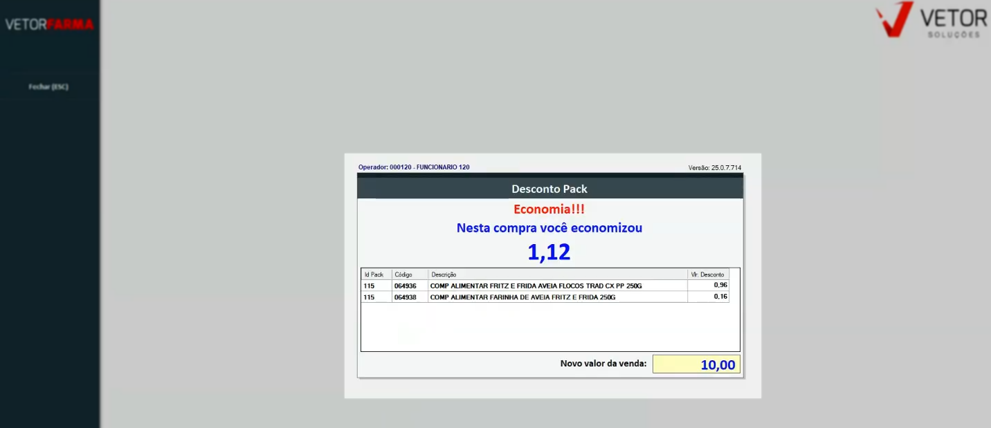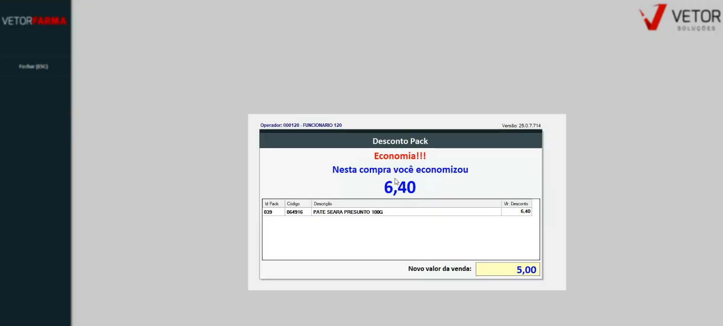 Se o BIN não for aceito, o sistema indicará que a promoção não se aplica ao meio de pagamento informado, permitindo que o cliente dê seguimento à finalização da venda, porém sem a concessão do desconto da promoção. Por outro lado, quando o BIN for reconhecido como válido, o sistema exibirá automaticamente a tela “Desconto Pack”, apresentando um resumo dos itens e valores aos quais o desconto é aplicado. Para continuar, basta encerrar a visualização da tela de desconto pressionando a tecla >> Esc.