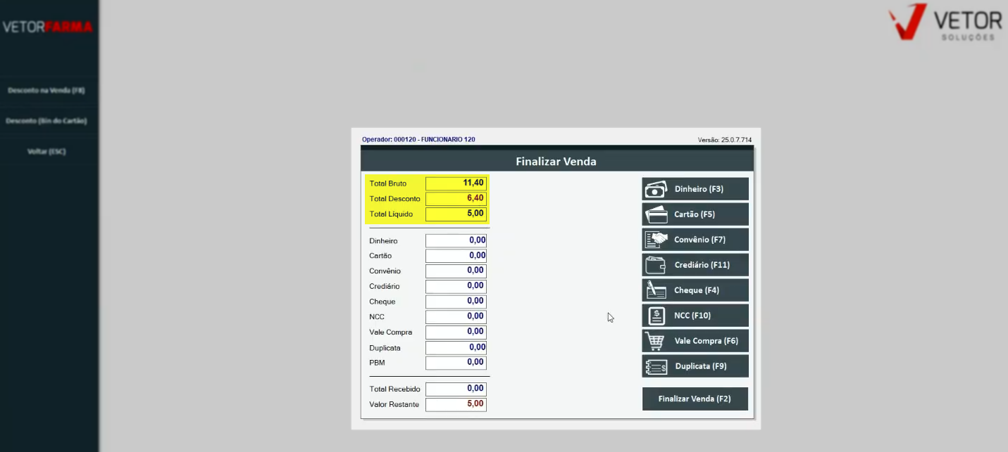Ao prosseguir com a finalização, os totais de recebimento apresentarão os descontos concedidos no campo "Total Desconto", enquanto o valor recalculado a "ser pago" será exibido no respectivo campo.