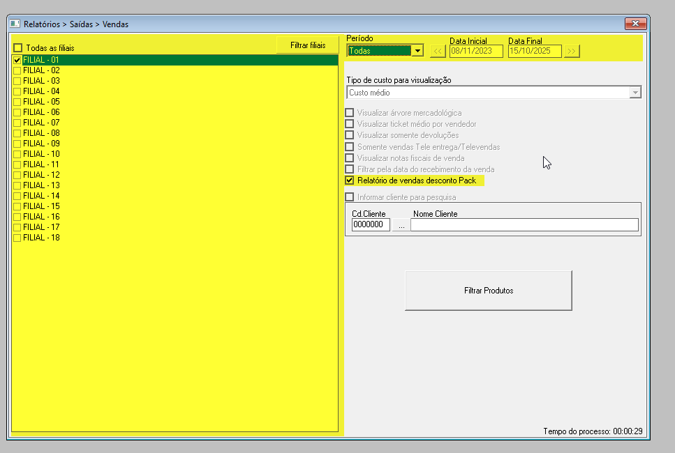 Em seguida, selecione ao lado esquerdo as lojas que deseja incluir na análise e, à direita da tela, defina o período, informando a data inicial e final da consulta. Depois, marque a opção “Relatório de vendas com desconto Pack”: