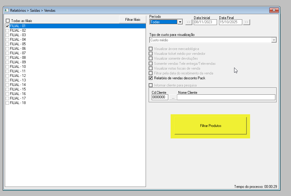Antes de gerar o relatório, também é possível utilizar o botão “Filtrar produtos”, que possibilita restringir a análise a itens específicos. Caso o filtro não seja aplicado, o sistema exibirá todos os produtos conforme os critérios informados.