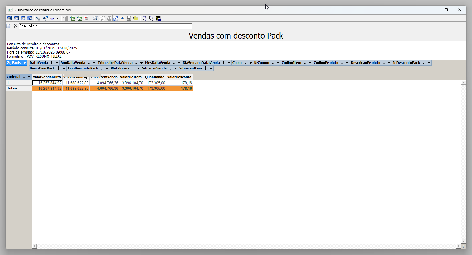E por fim, pressione a tecla >> F6 para processar a busca de acordo com as configurações definidas. A seguir, o sistema exibirá o relatório no formato cubo, permitindo que o usuário personalize e organize as informações conforme sua preferência. Veja um exemplo de como o relatório é apresentado. Quer aprender a personalizar esse tipo de relatório? Clique aqui.