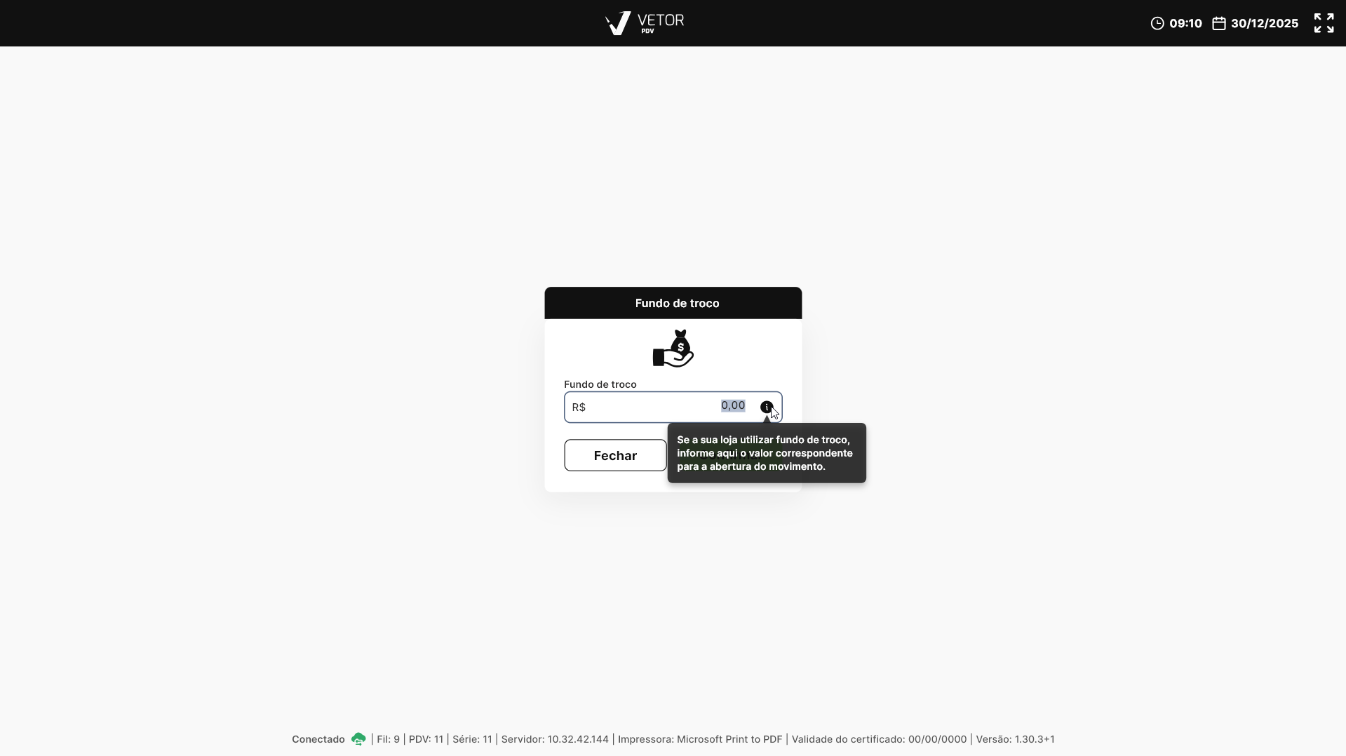 A seguir, uma nova tela chamada "Fundo de troco" será exibida para as empresas que utilizam a funcionalidade. Ela permite informar o valor do fundo de troco, isto é, o valor destinado a auxiliar o operador nas primeiras operações de venda, facilitando o troco em situações em que ainda não há valores em caixa. Caso a empresa utilize esse recurso, basta informar a quantia inicial e clicar em >> Confirmar, do contrário basta clicar em >> Fechar.