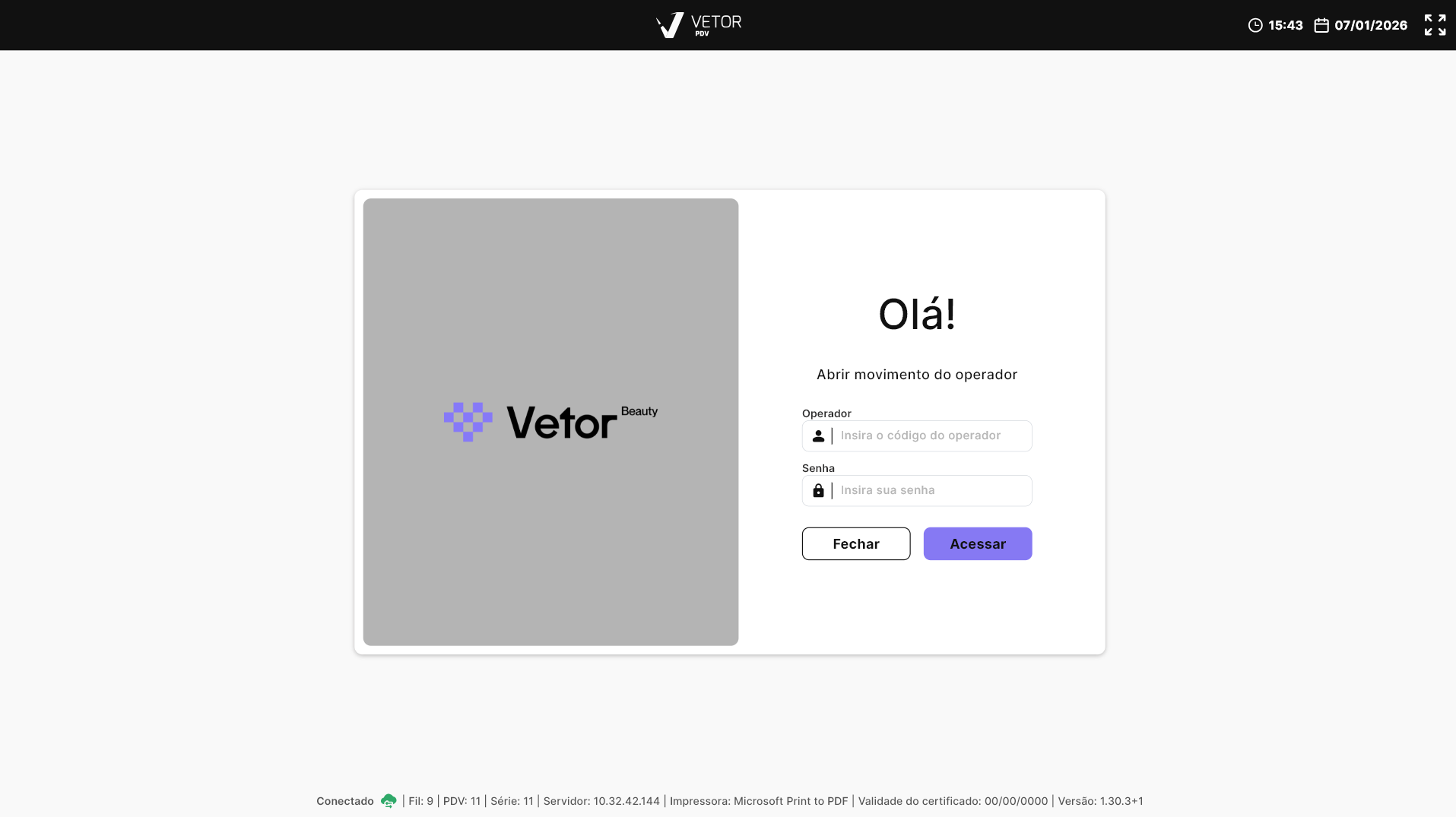 Ao iniciar o PDV Beauty, será exibida a tela "Abrir movimento do operador", na qual o operador designado deverá realizar a abertura do movimento. Para isso, é necessário realizar a autenticação.