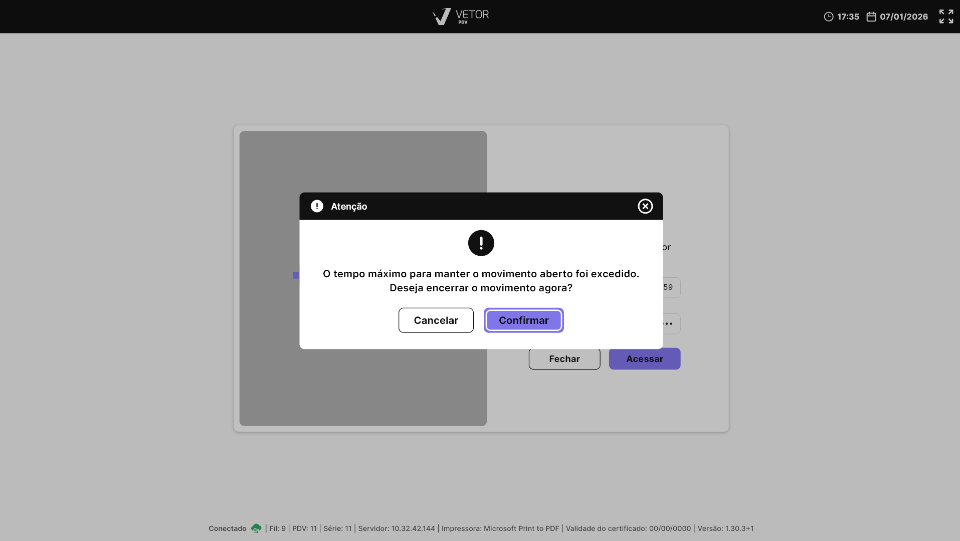 Nos cenários em que o movimento do operador não tiver sido fechado anteriormente, após a autenticação do operador, será exibido um alerta informando que é necessário encerrar o movimento antigo, pois o tempo do movimento aberto foi excedido. Clique em >> Confirmar para fechar o movimento e prosseguir novamente para a abertura. Dúvidas sobre como fechar um movimento? Clique aqui.