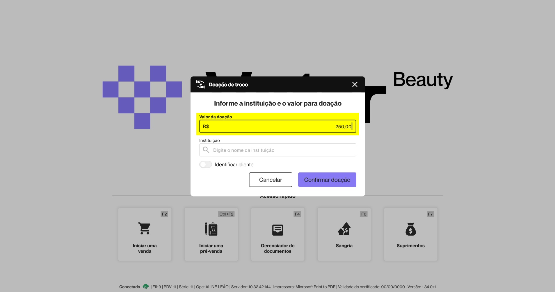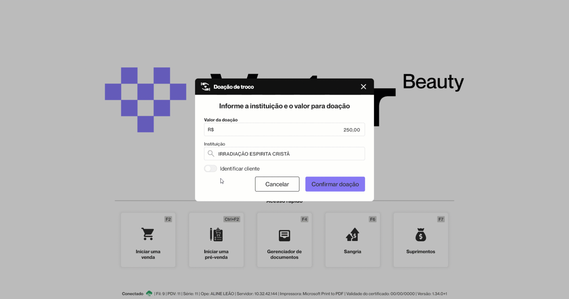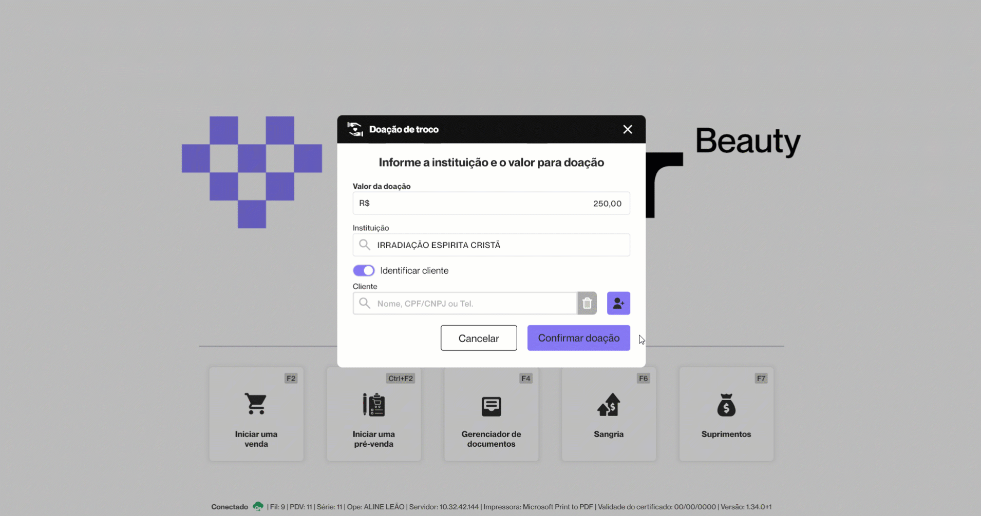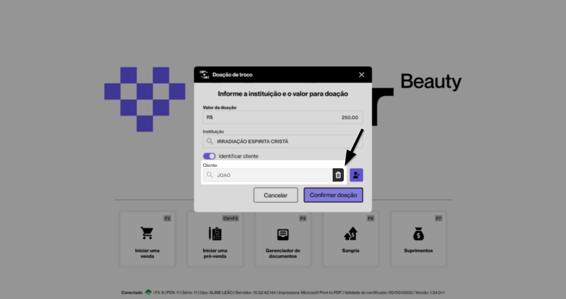 Durante o registro da doação, o operador pode optar por identificar o doador. Para isso, é necessário ativar a opção "Identificar cliente", que habilitará o campo "Cliente" para a inserção dos dados correspondentes.