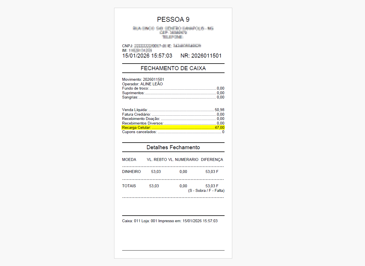 Após a conclusão da venda, será gerado um comprovante não fiscal. Esse comprovante poderá ser impresso imediatamente ou, conforme a configuração do terminal, podendo ser salvo em uma pasta específica para esse tipo de arquivo, permitindo a consulta ou impressão posterior. Além disso, os valores referentes a esse tipo de operação serão exibidos no comprovante de fechamento de caixa com a descrição “Recarga de celular”, identificando corretamente esse tipo de recebimento. Acompanhe o exemplo, a seguir:
