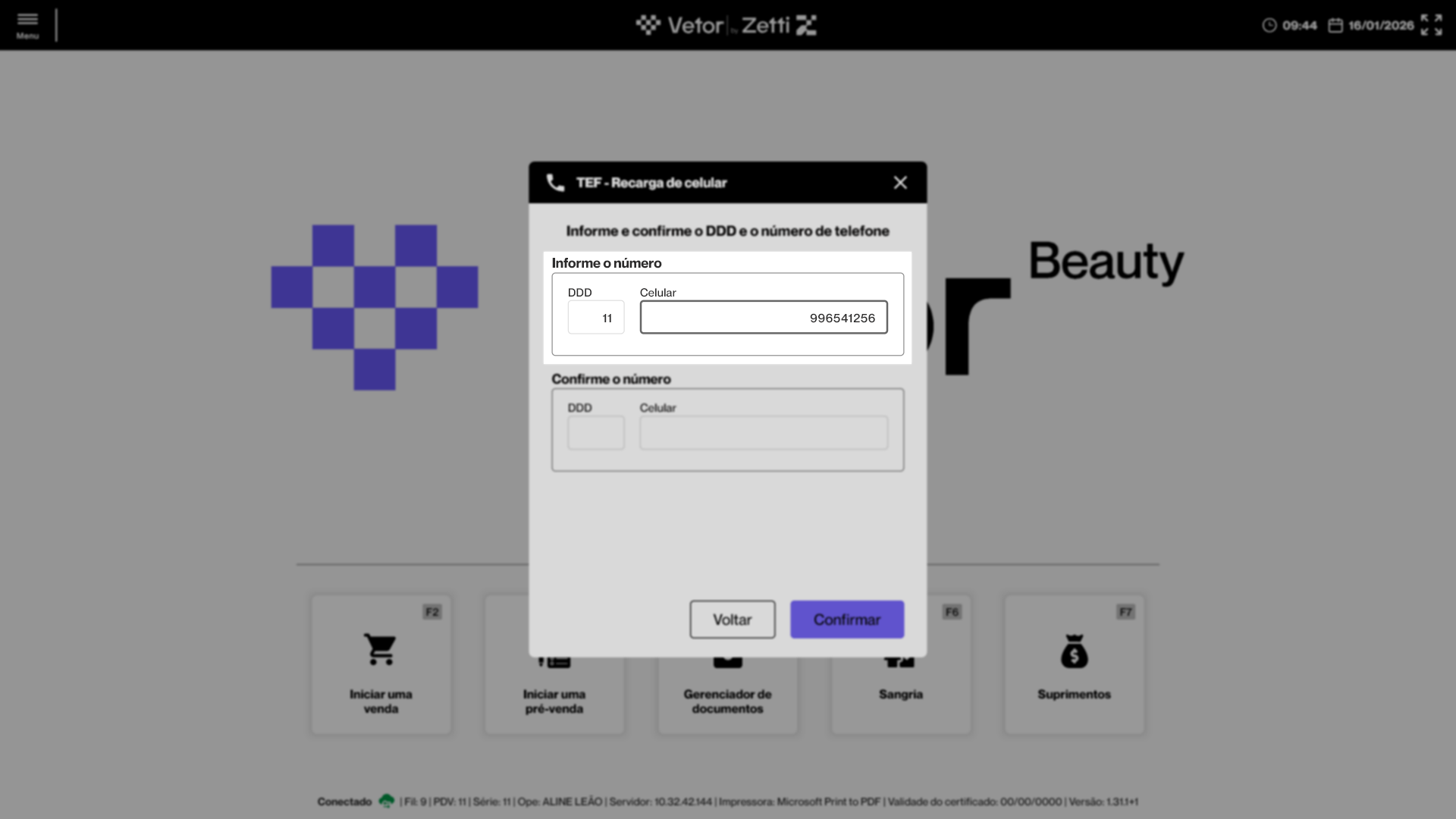 Ao abrir a tela de recarga, o operador visualizará duas seções principais, organizadas para garantir a identificação correta do número do celular que receberá os créditos. Continue a leitura para conhecer todo o processo, que envolve o preenchimento e a validação do número do cliente, a seleção da operadora e do valor da recarga, até a finalização do pagamento.