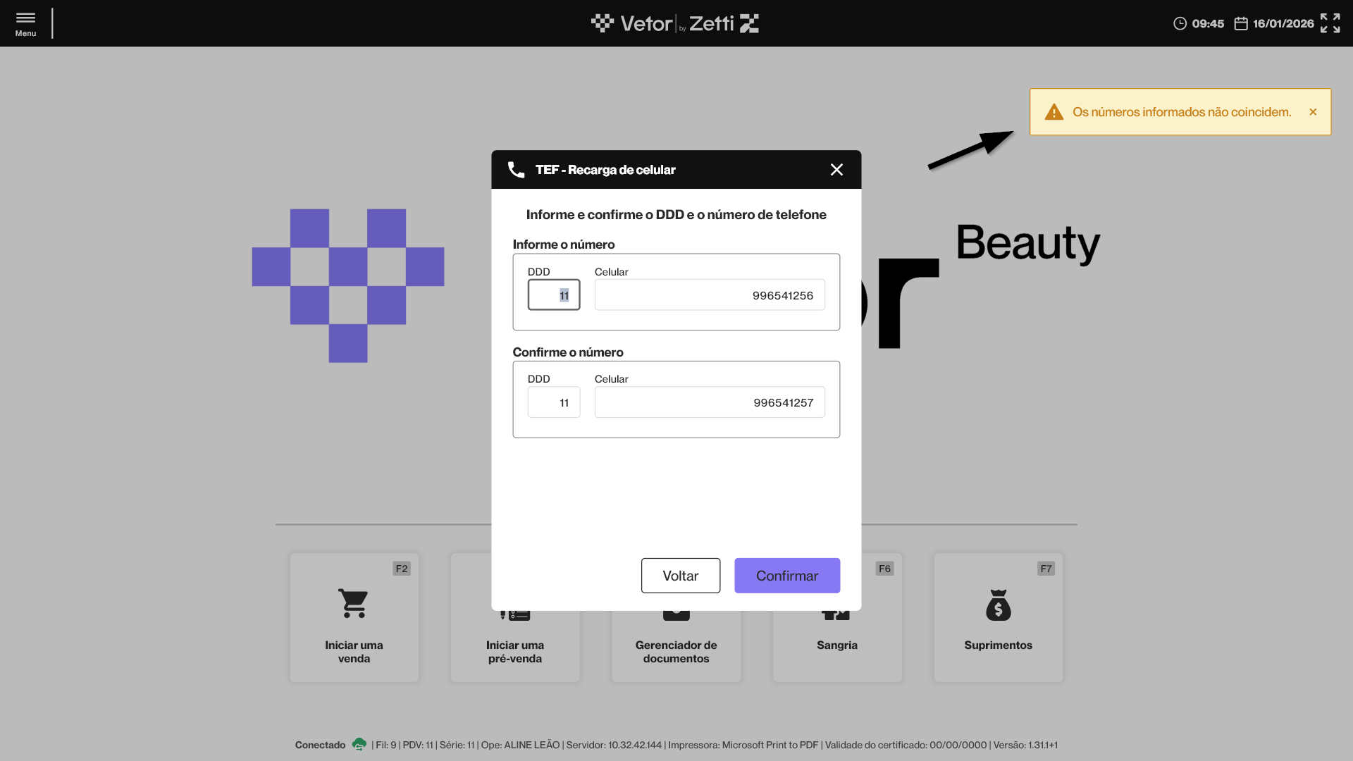 Se o número digitado para confirmação for diferente do informado anteriormente, o sistema exibirá um alerta na tela e impedirá que o operador dê continuidade ao processo.