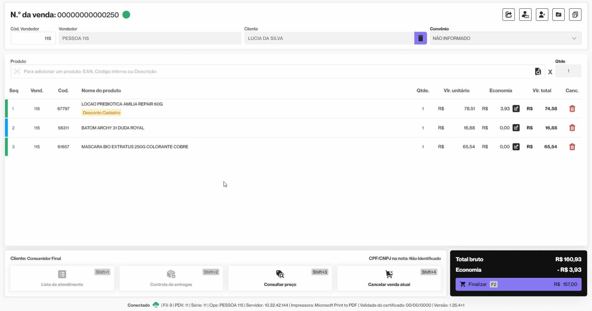 Caso necessário, repita o procedimento para os demais produtos da venda. Em seguida, a venda poderá ser finalizada normalmente. Para acessar a documentação sobre os recebimentos disponíveis e a finalização da venda, clique aqui.