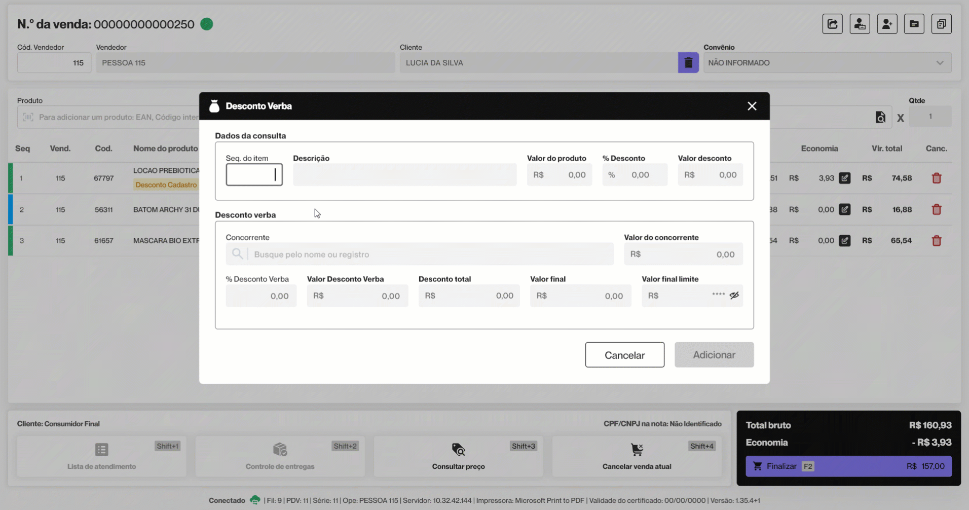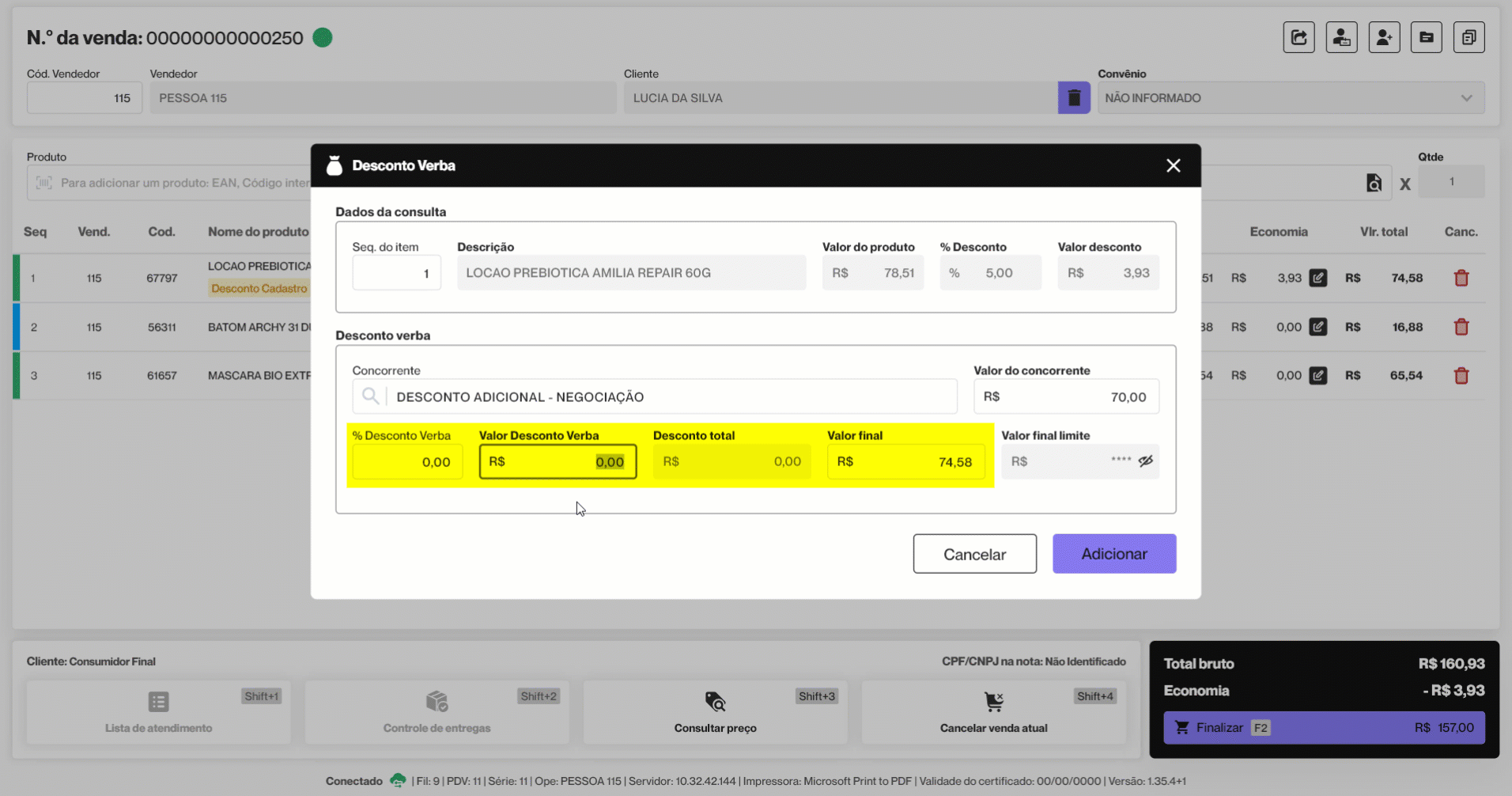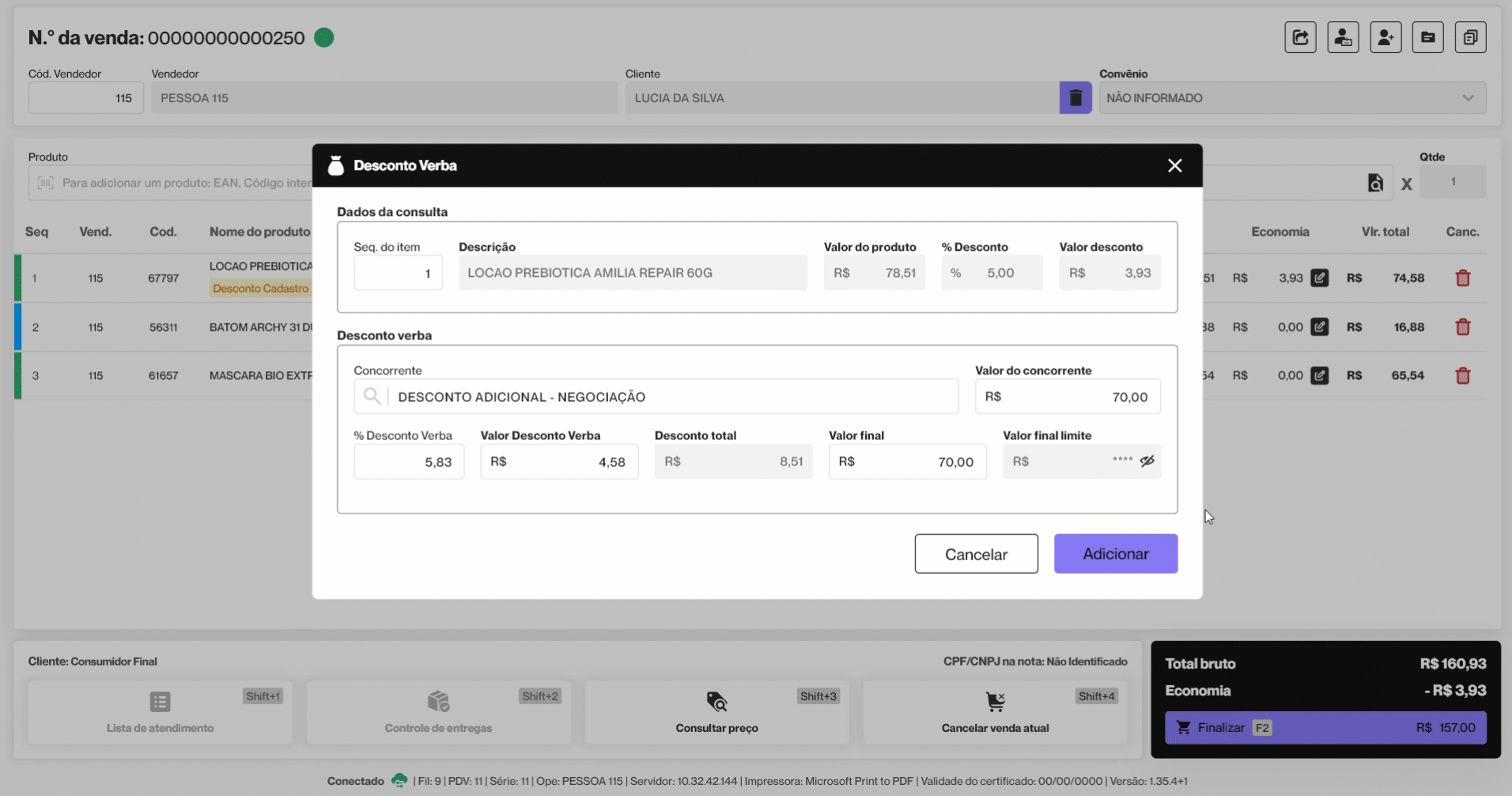 O Desconto Verba é um valor definido mensalmente para cada filial, criado para permitir descontos estratégicos em negociações específicas. Esse valor funciona como um limite disponível para que a equipe possa conceder descontos de forma controlada, sem comprometer o planejamento financeiro da empresa. Ele pode ser utilizado quando o cliente informa que encontrou o mesmo produto por um preço menor em outro estabelecimento ou apresenta um valor de referência para a compra. Nesses casos, se houver saldo disponível na verba e o operador tiver permissão, o desconto pode ser aplicado para viabilizar a venda.