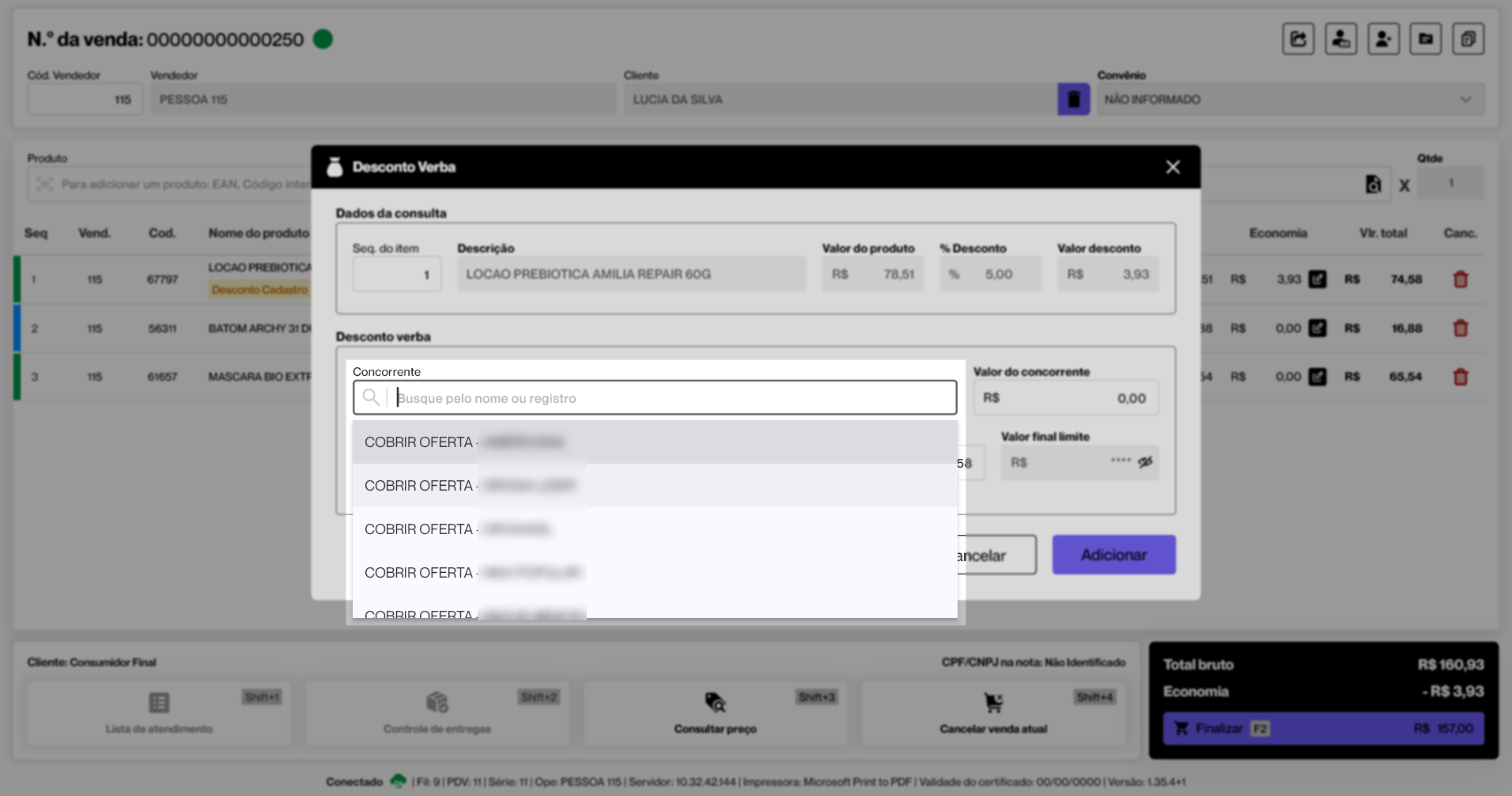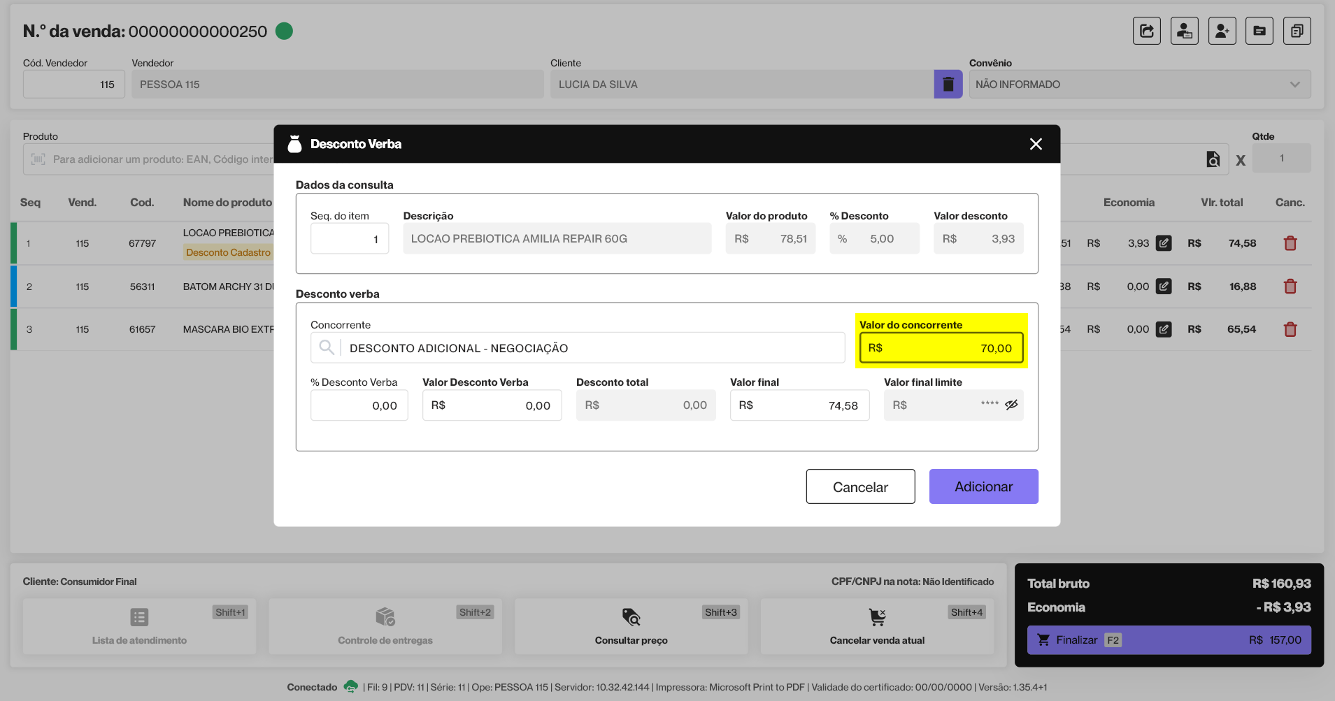 Na sequência, preencha o campo "Valor do concorrente" com o valor informado pelo cliente como referência para a concessão do desconto. Esse valor corresponde ao preço sugerido pelo cliente, podendo estar relacionado a um valor que ele afirma ter encontrado em outra loja ou a um valor que considera adequado para a compra. É aconselhável que o valor final aplicado no desconto seja menor ou igual o valor sugerido pelo cliente.