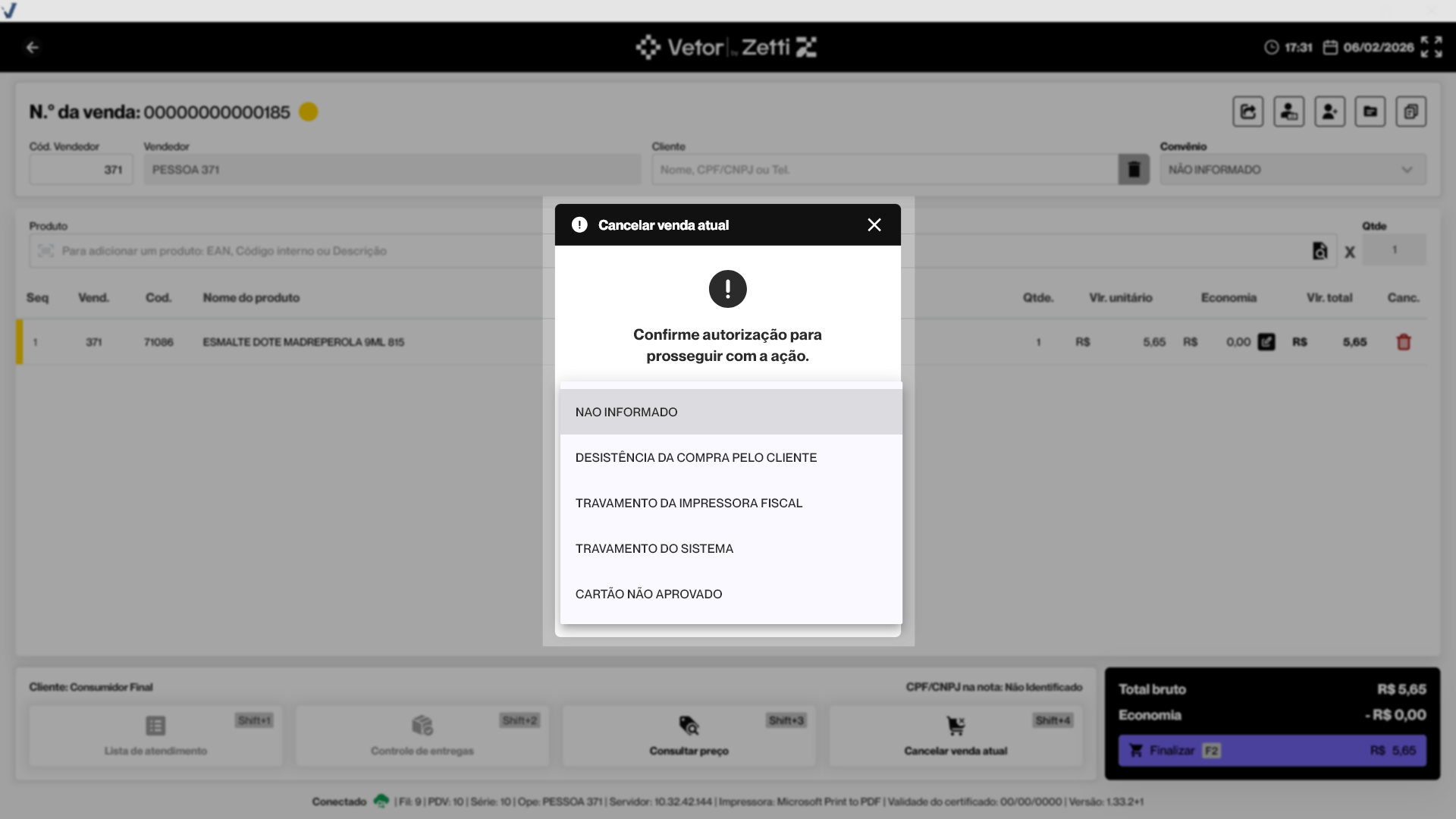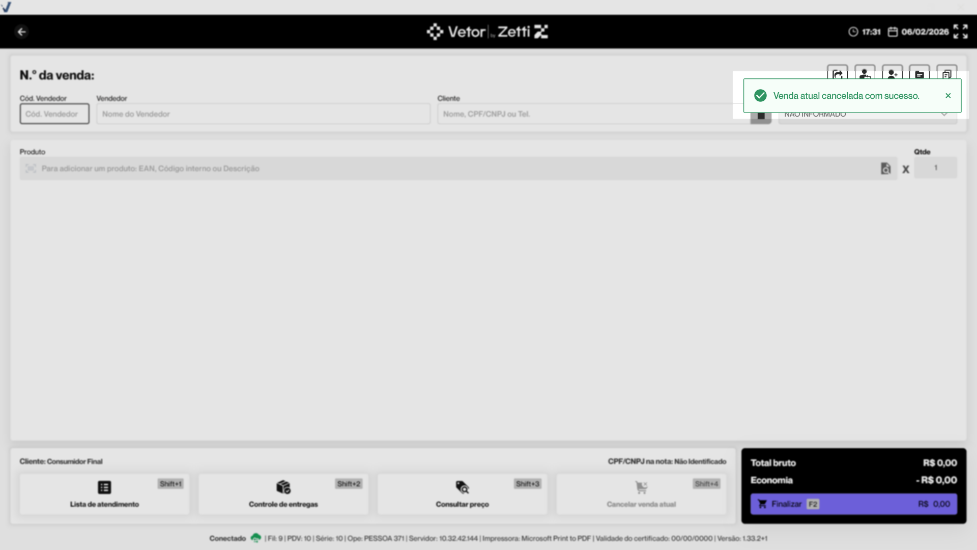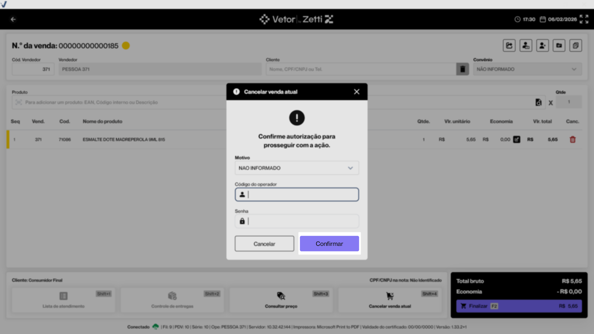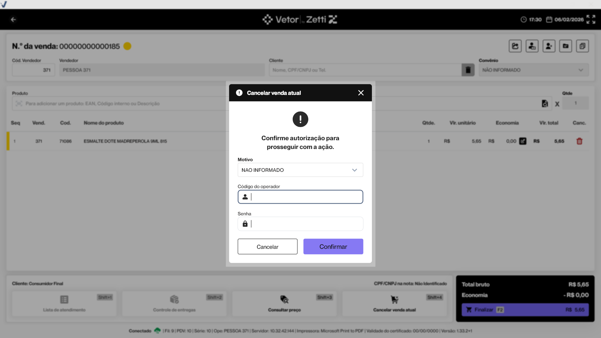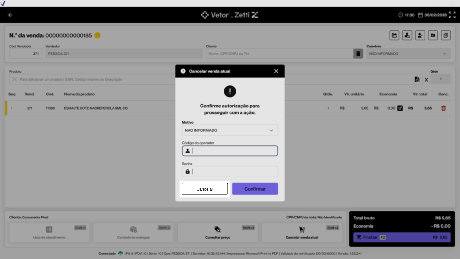 Vetor Farma PDV Beauty PDV Beauty - Menu Vendas PDV Beauty - Venda (F2) Current: PDV Beauty - Cancelar Venda Atual (Shift+4) PDV Beauty - Cancelar Venda Atual (Shift+4) O cancelamento da venda atual é uma operação que exclui a venda iniciada, permitindo que o operador recomece o processo. Geralmente, essa operação é utilizada quando o vendedor inicia uma venda e o cliente desiste, não finalizando a compra. Em resumo, a funcionalidade permite ao operador interromper e cancelar a venda em andamento de maneira simples e eficiente, garantindo que o processo de vendas seja reiniciado corretamente.AutenticaçãoEssa solução oferece diferentes maneiras de autenticação, como login e senha, token, entre outras. A escolha do método vai depender das configurações e preferências de acesso definidas pela loja.Neste documento, abordaremos o processo utilizando o método de autenticação **login e senha**. Caso esteja utilizando outro método, siga as instruções específicas para garantir a identificação, autorização e/ou registro correto da operação. Para mais informações sobre os diferentes tipos de autenticação, consulte o processo detalhado na base de conhecimento.Pré-requisitoO cancelamento só pode ser realizado se a venda já estiver iniciada, ou seja, com produtos adicionados.Como acessarRealize o login no PDV BeautyAo acessar a solução, na tela de venda, clique no botão >>"Cancelar Venda Atual", localizado na parte inferior da tela, ou utilize o atalho Shift+4.Ou ainda, na tela de finalização, após clicar em "Finalizar Venda (F2)", o botão >> "Cancelar Venda Atual" também será exibido no rodapé da página.1º Passo – Cancelamento de Venda AtualApós selecionar a opção de cancelamento, uma janela será exibida, solicitando as seguintes informações:Motivo: Selecione o motivo da desistência no menu pré-definido do sistema.O campo "Motivo" não é obrigatório, mas sempre que possível, preencha ele com a justificativa adequada. Isso garante maior rastreabilidade e facilita futuras análises e auditorias. Os motivos precisam ser cadastrados previamente. Em caso de dúvidas, entre em contato com nossa equipe. Código do Operador: Informe o código do operador para identificar quem está realizando o cancelamento.Senha: Digite a senha do operador para autenticar a operação.Em seguida, após preencher as informações, o operador deve clicar em >> "Confirmar", para efetuar o cancelamento. Se o cancelamento for efetuado, uma mensagem confirmando a operação será mostrada no canto superior direito da tela. No entanto, caso o cliente desista do cancelamento, basta selecionar >> "Cancelar", para retornar à tela de venda.O cancelamento da venda atual é um procedimento rápido e seguro, essencial para garantir a precisão dos registros, minimizar transtornos ao cliente e manter a integridade das operações. Se desejar cancelar uma venda já finalizada, clique aqui para mais informações. Experiências Compartilhe sua experiência ✍️ Clique aqui, descreva o cenário com a experiência e a tratativa aplicada. Seu relato será avaliado e, se aprovado, contribuirá para a troca de conhecimento. Nota final Este tópico tem como objetivo esclarecer pontos específicos e complementares relacionados à documentação, oferecendo informações adicionais que contribuem para uma melhor compreensão do conteúdo apresentado.Clique aqui e confira a nota finalDestaques visuais apresentados no documento. Explore outros conteúdos e descubra o passo a passo da operação. Pesquisa ×