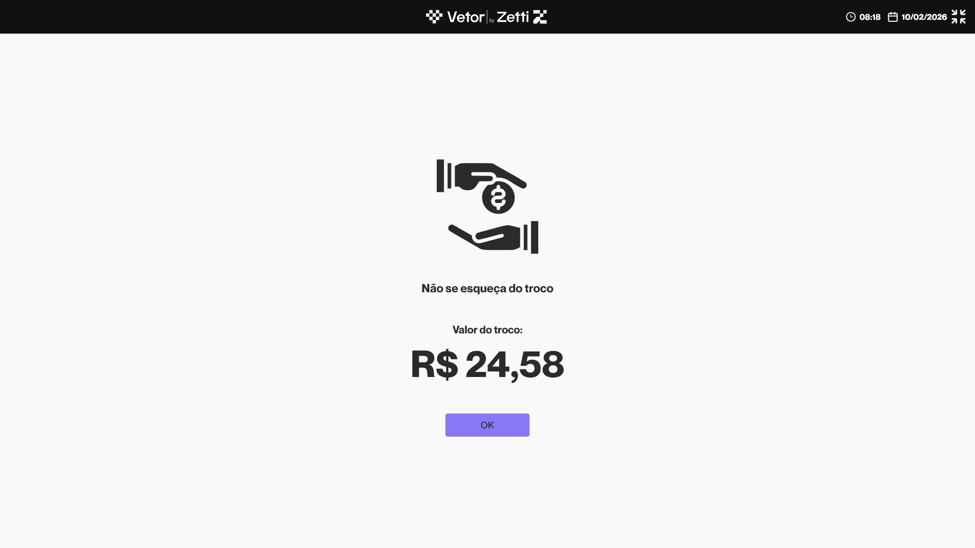 Ao finalizar uma venda que gera saldo de troco, o sistema apresenta uma tela informando o valor do troco a ser devolvido. Essa informação será exibida no campo "Valor troco". Para prosseguir, clique em >> OK.