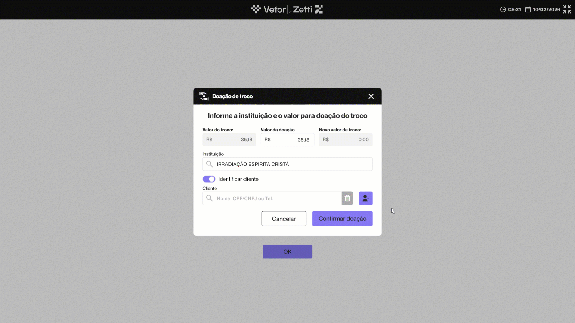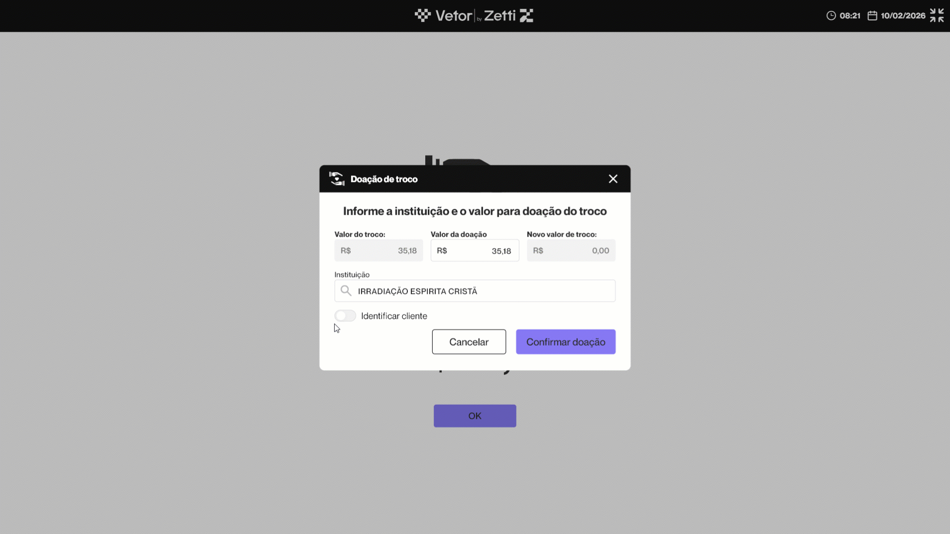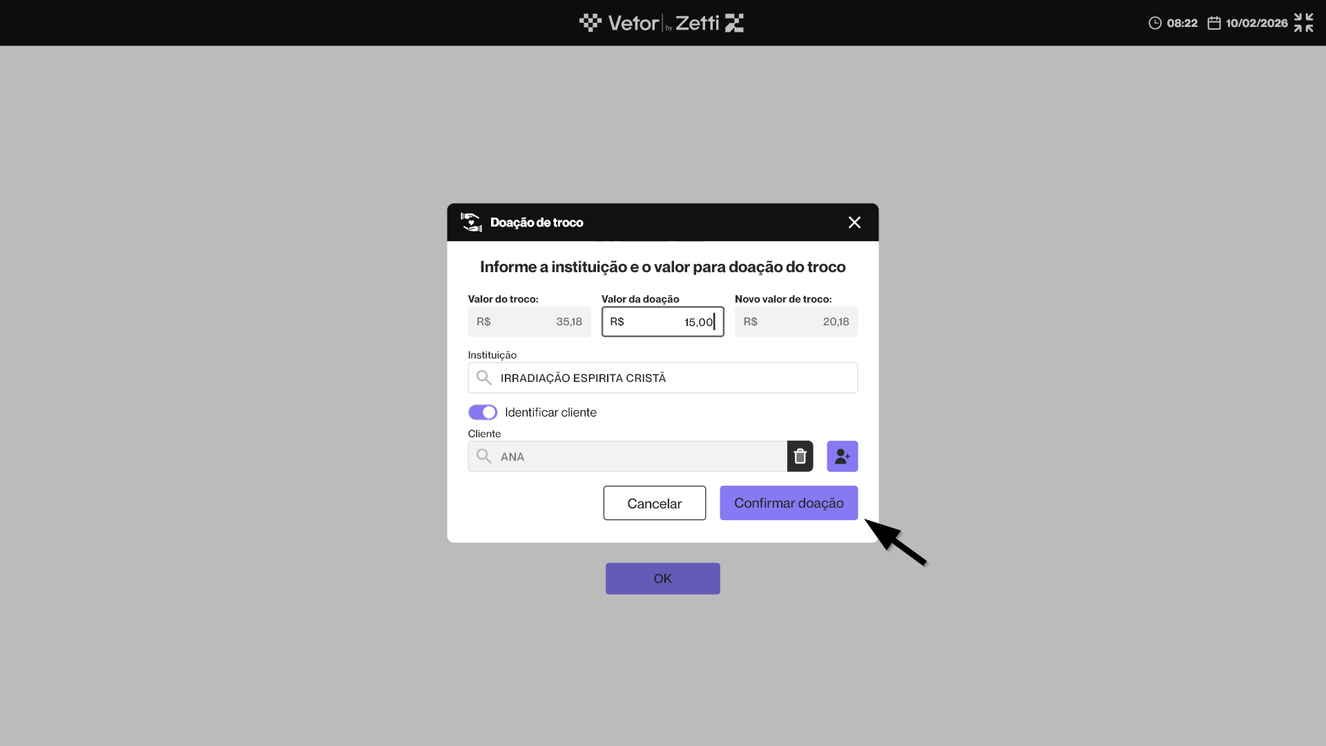Dessa forma, o operador deve perguntar ao cliente se ele deseja utilizar o valor do troco para realizar uma doação. Caso o cliente aceite, o operador deve clicar em >> Confirmar. E se o cliente não desejar realizar a doação, basta clicar em >> Cancelar, e a venda será finalizada de forma padrão.