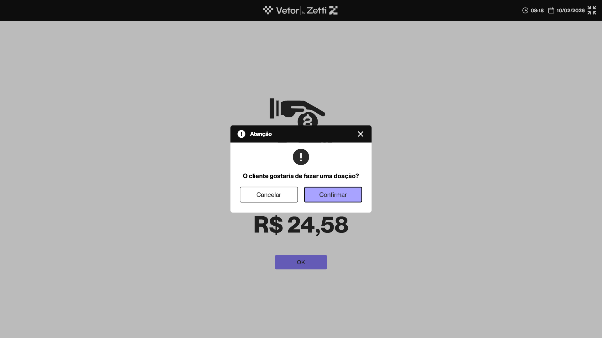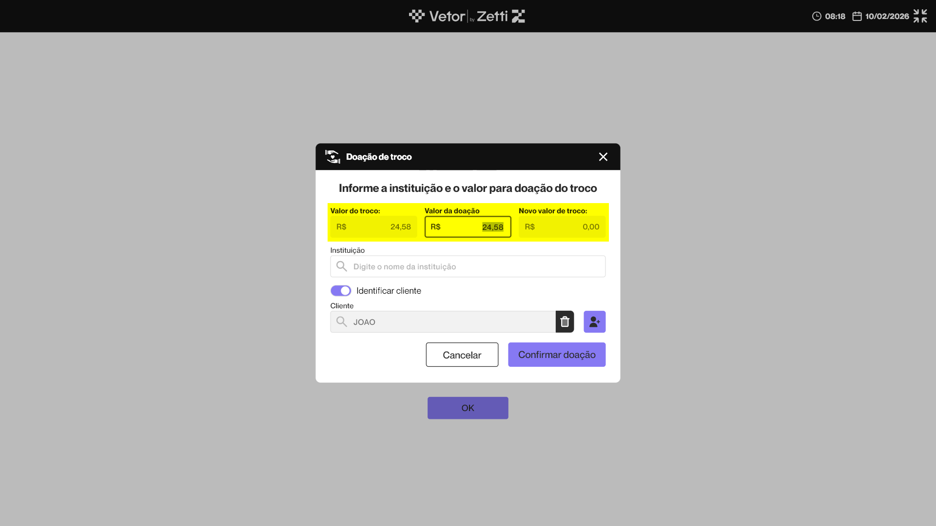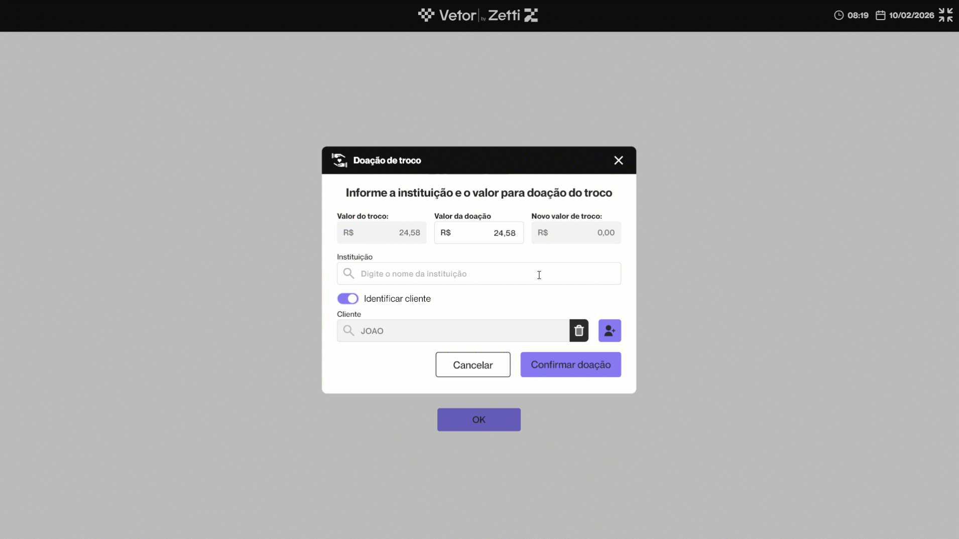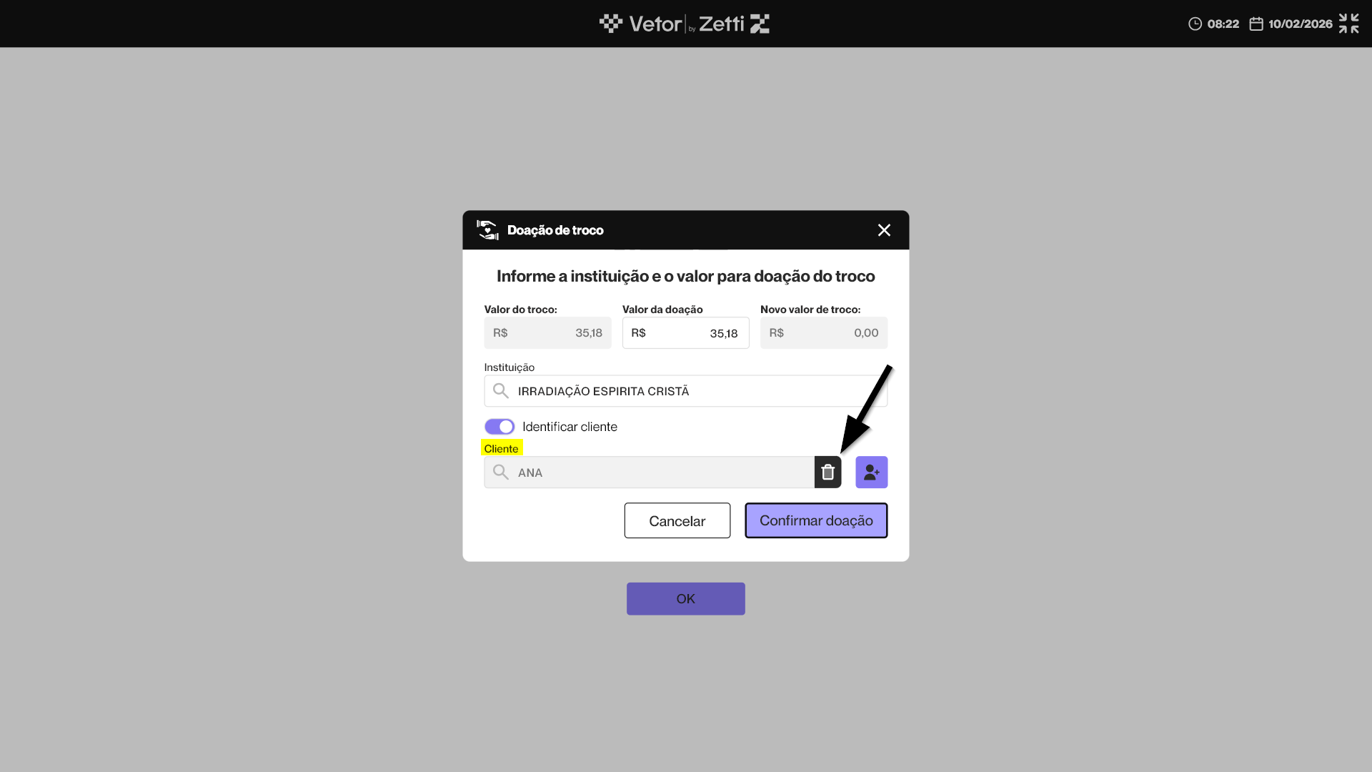 Dessa forma, o operador deve perguntar ao cliente se ele deseja utilizar o valor do troco para realizar uma doação. Caso o cliente aceite, o operador deve clicar em >> Confirmar. E se o cliente não desejar realizar a doação, basta clicar em >> Cancelar, e a venda será finalizada de forma padrão.