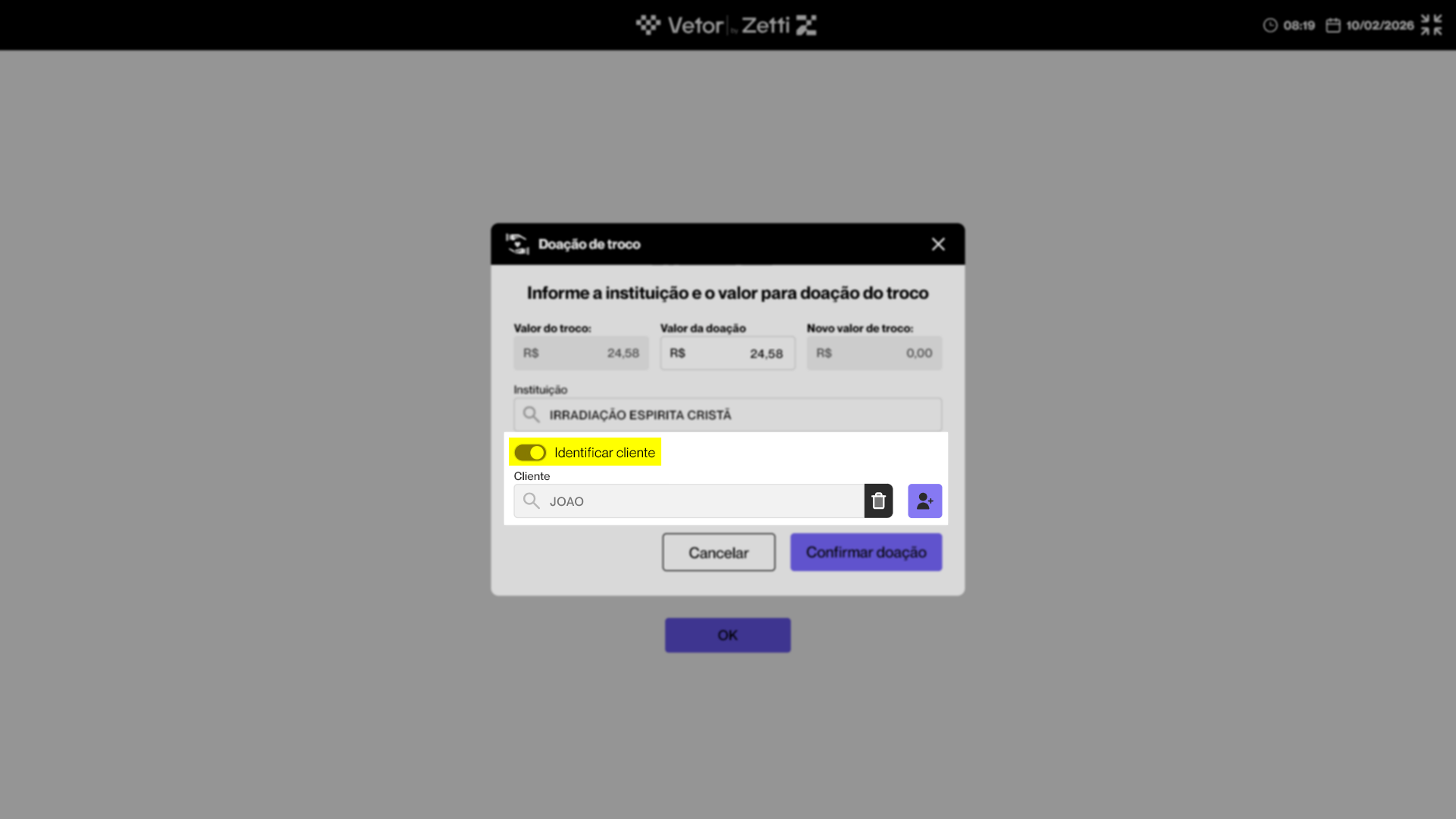 Se a venda for realizada para um consumidor final, porém o doador desejar ser identificado, o vendedor deve ativar a opção "Identificar cliente". Em seguida, mesmo que o cliente não tenha sido identificado no início da venda, caso já possua cadastro, o vendedor poderá informá-lo no campo “Cliente”, utilizando nome, CPF, CNPJ ou telefone. Após localizar o cadastro, basta selecioná-lo. Com o cliente identificado, seus dados constarão no comprovante da doação.