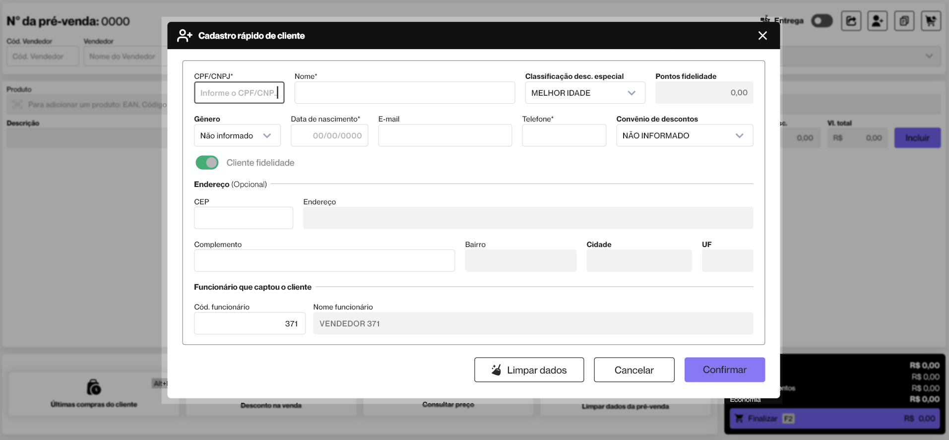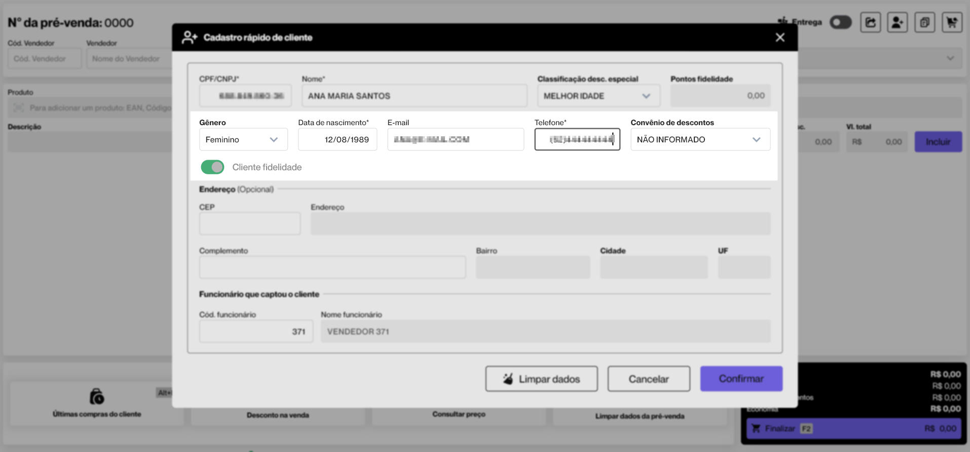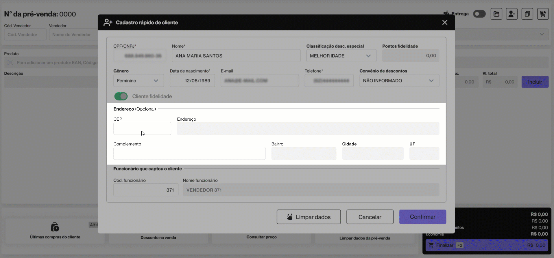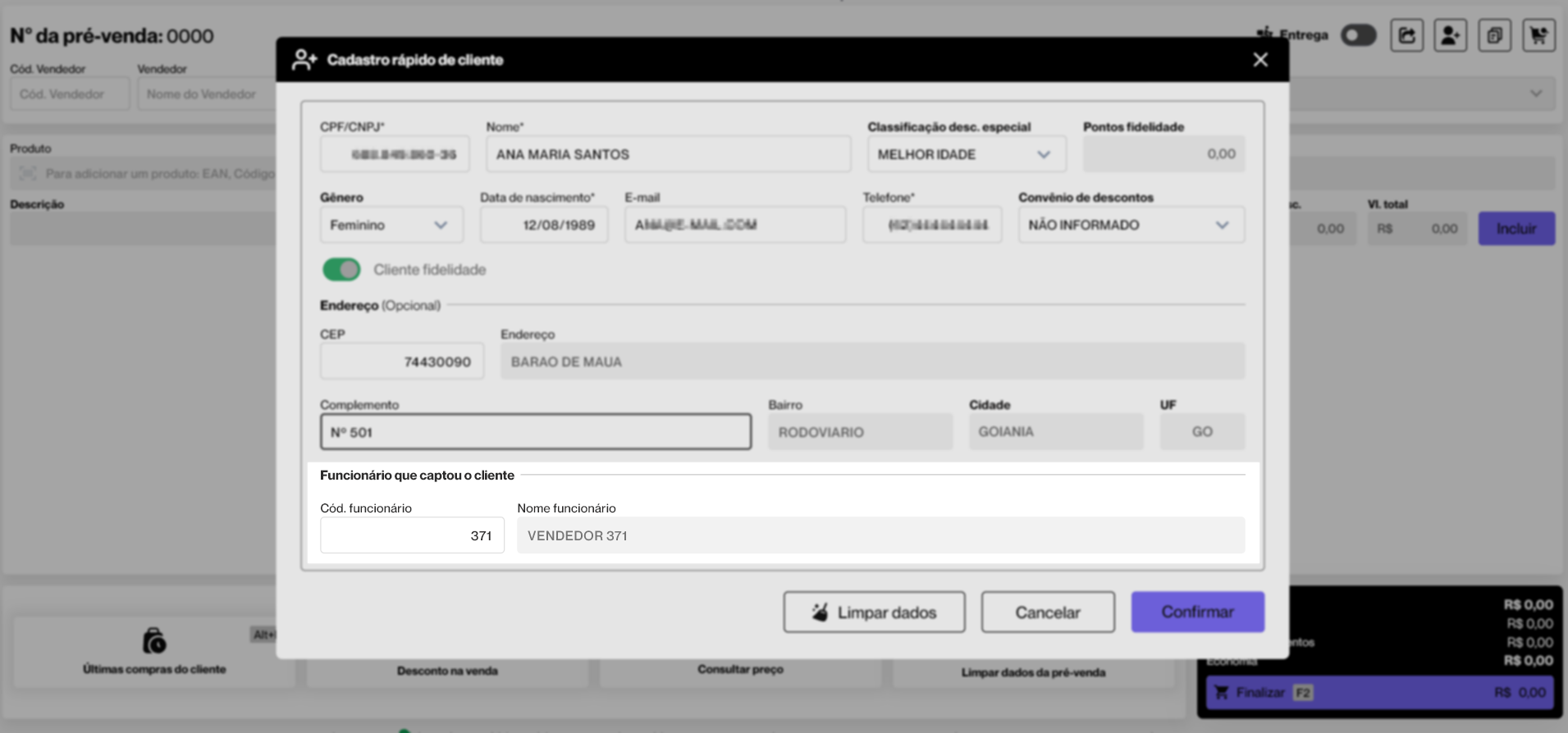 Para concluir o cadastro, o operador pode, se necessário, alterar a identificação do “Funcionário que captou o cliente”, na seção localizada na parte inferior da tela. Por padrão, o sistema apresenta automaticamente o código e o nome do funcionário vinculado à operação em andamento, seja na tela de Venda ou de Pré-venda, de onde o cadastro rápido foi acionado por meio do botão específico já mencionado no início deste documento. Caso a tela de cadastro tenha sido acionada antes da identificação do funcionário na operação, serão considerados automaticamente os dados do colaborador que realizou a abertura de movimento no PDV.