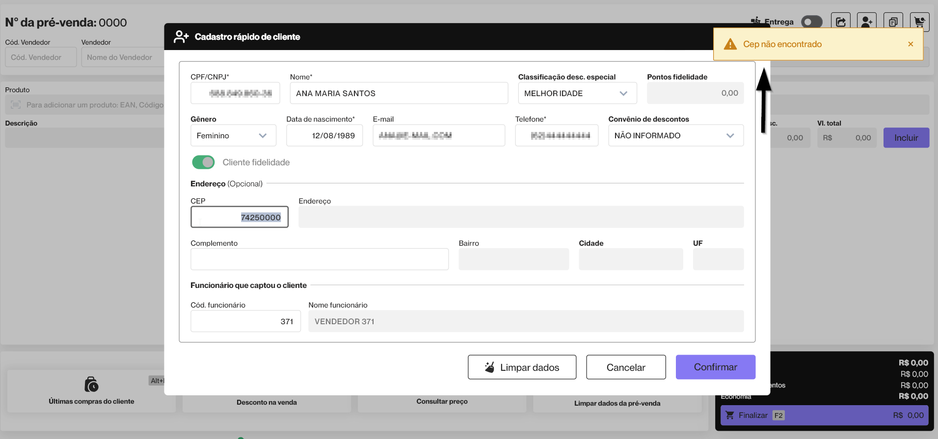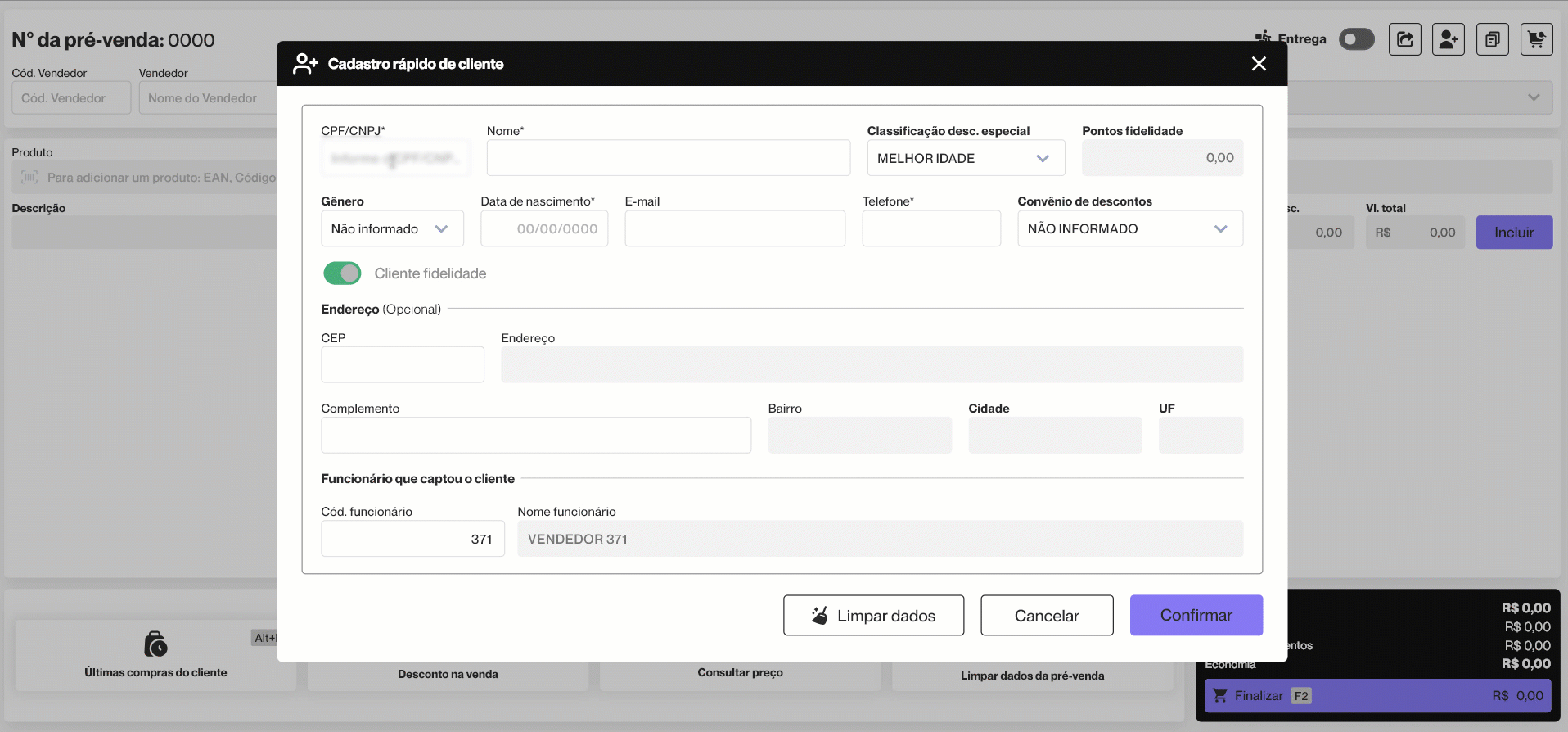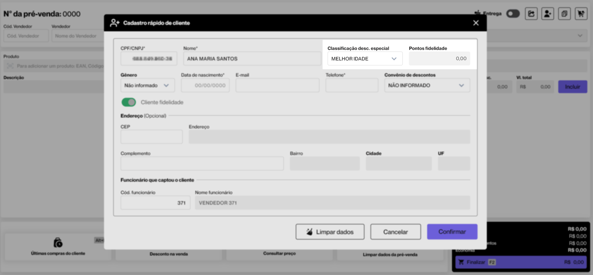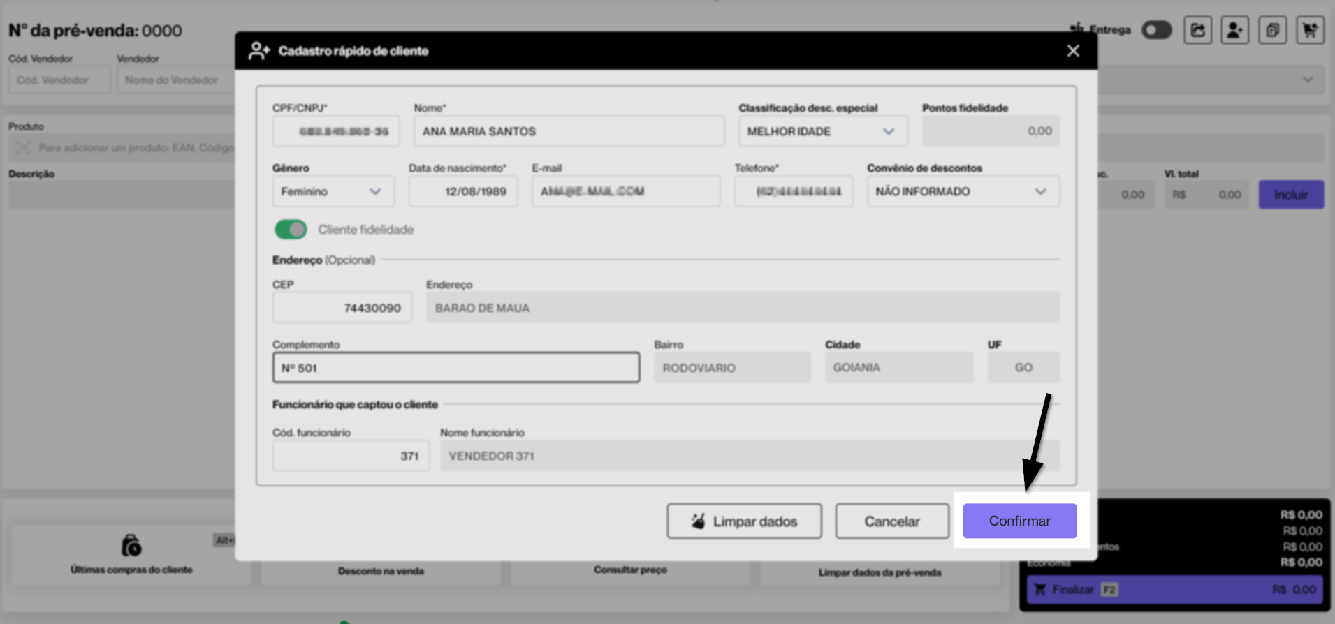 Para concluir o cadastro, o operador pode, se necessário, alterar a identificação do “Funcionário que captou o cliente”, na seção localizada na parte inferior da tela. Por padrão, o sistema apresenta automaticamente o código e o nome do funcionário vinculado à operação em andamento, seja na tela de Venda ou de Pré-venda, de onde o cadastro rápido foi acionado por meio do botão específico já mencionado no início deste documento. Caso a tela de cadastro tenha sido acionada antes da identificação do funcionário na operação, serão considerados automaticamente os dados do colaborador que realizou a abertura de movimento no PDV.