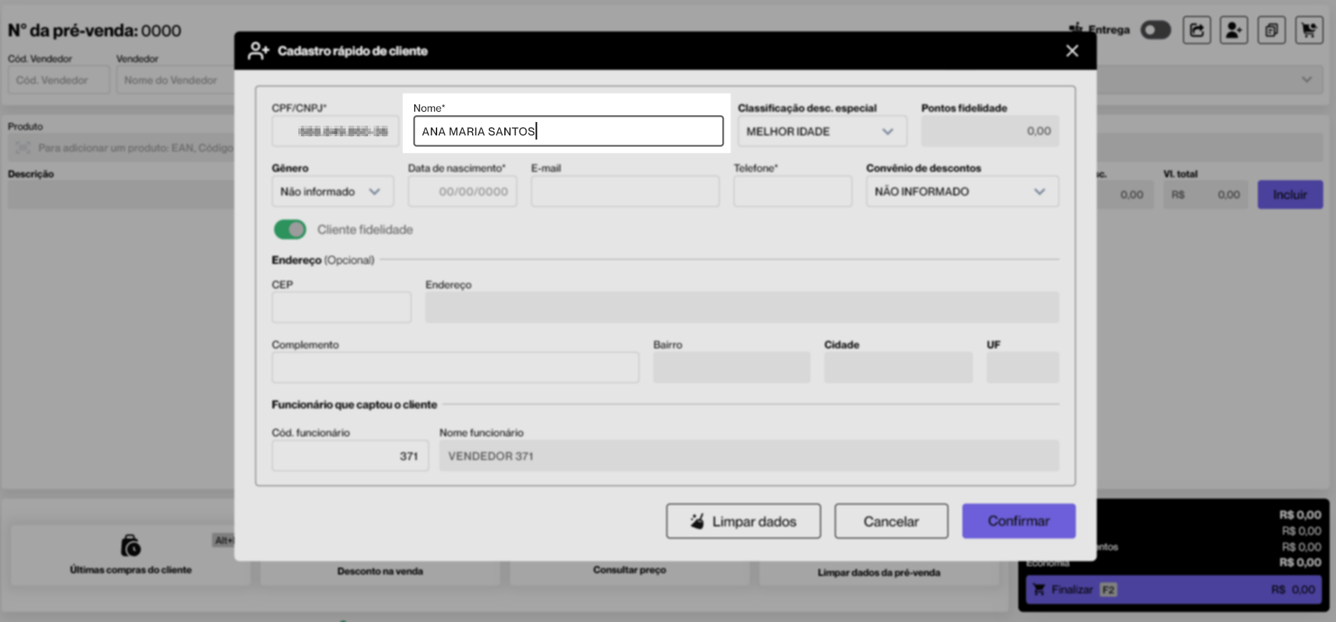 Em seguida, a tela de cadastro será fechada e o sistema retornará automaticamente à tela que originou a operação, já exibindo o nome do cliente vinculado ao atendimento. A partir desse momento, basta dar continuidade ao processo desejado, seja em "Pré-venda", para registrar um pedido e finalizá-lo posteriormente, ou em "Venda", para concluir a operação imediatamente.