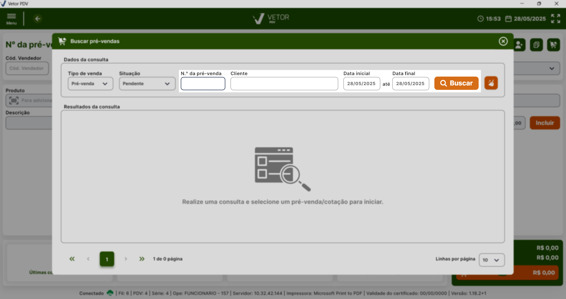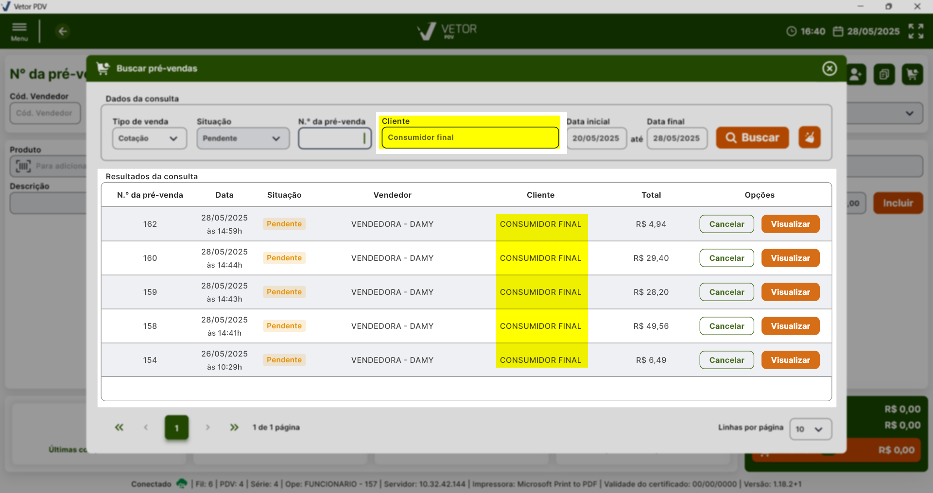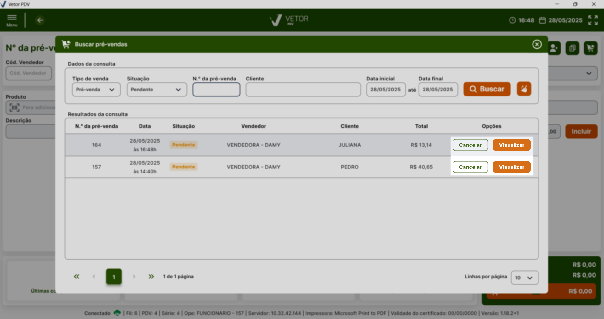 Ao selecionar esta opção, será possível identificar os registros do tipo pré-venda, ou seja, aqueles que foram enviados ao caixa. Além disso, é possível cancelar pré-vendas que ainda estejam pendentes, ou seja, que foram encaminhadas ao caixa, mas ainda não capturadas.
