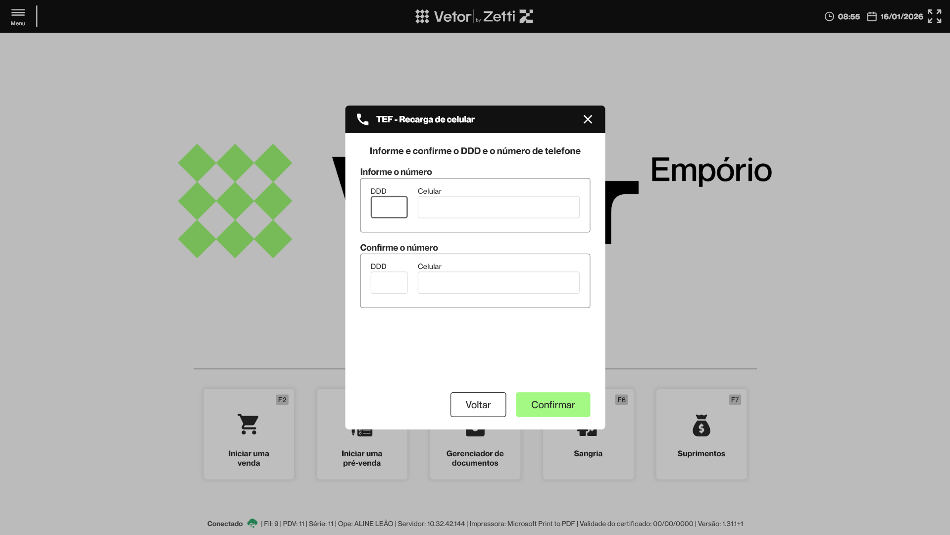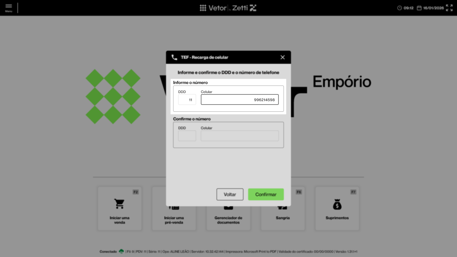 Ao abrir a tela de recarga, o operador visualizará duas seções principais, organizadas para garantir a identificação correta do número do celular que receberá os créditos. Continue a leitura para conhecer todo o processo, que envolve o preenchimento e a validação do número do cliente, a seleção da operadora e do valor da recarga, até a finalização do pagamento.