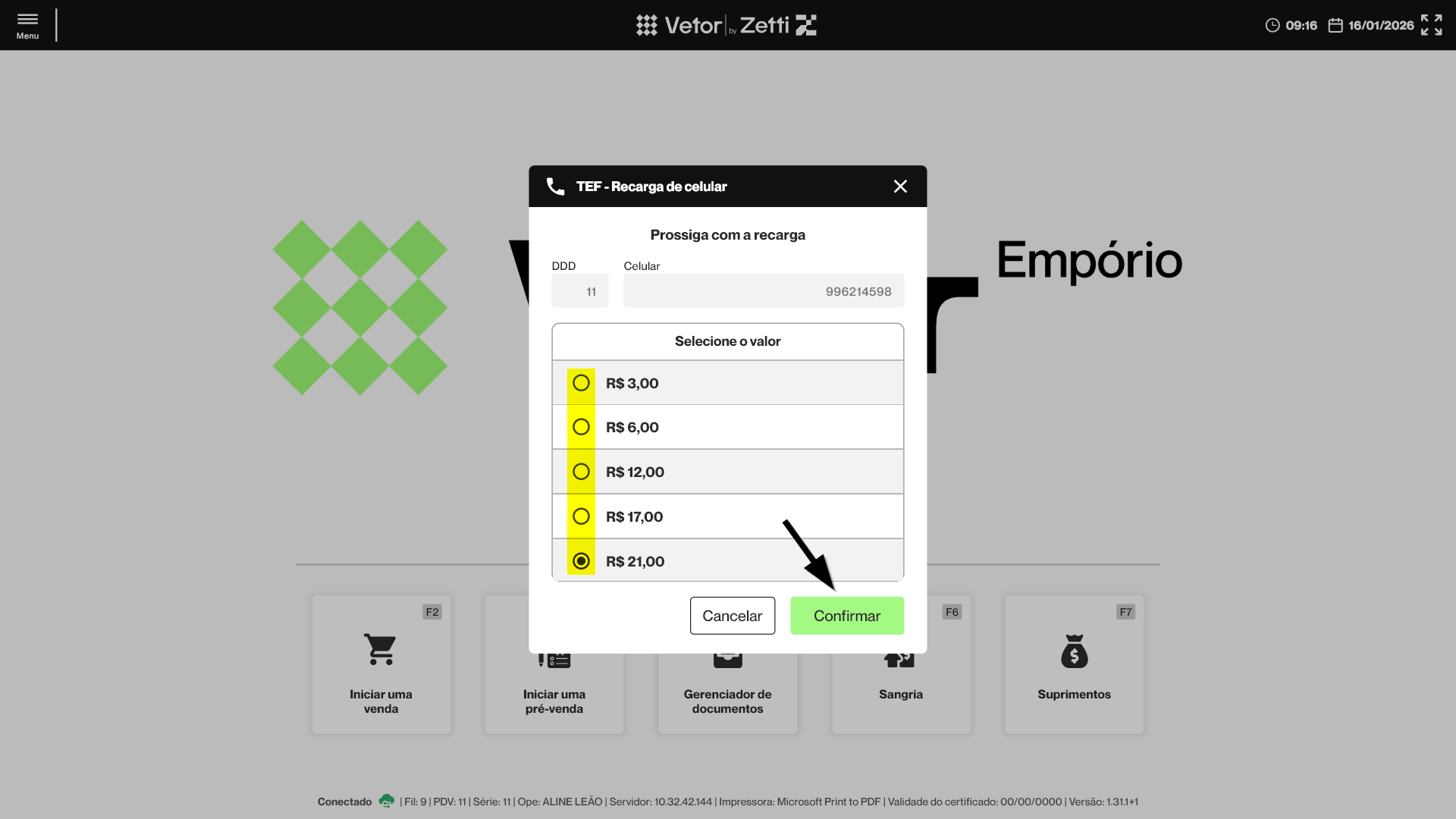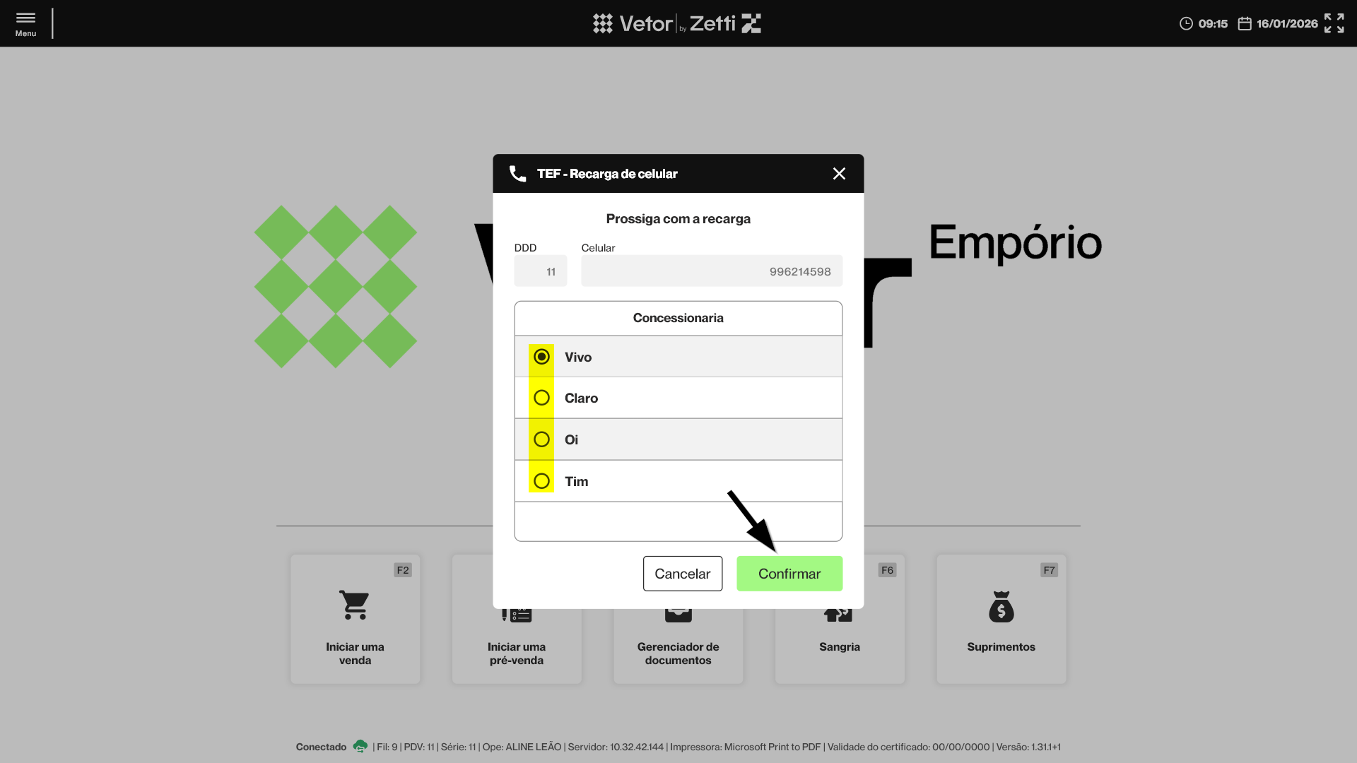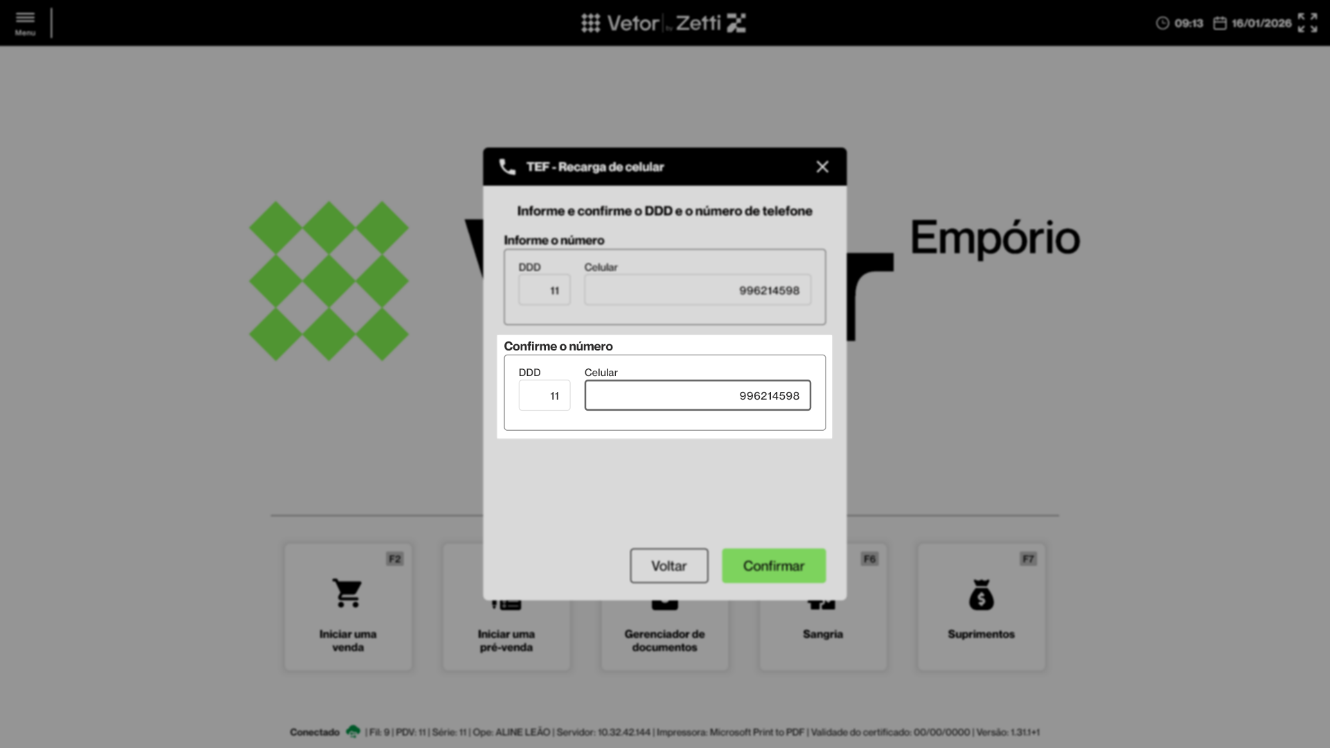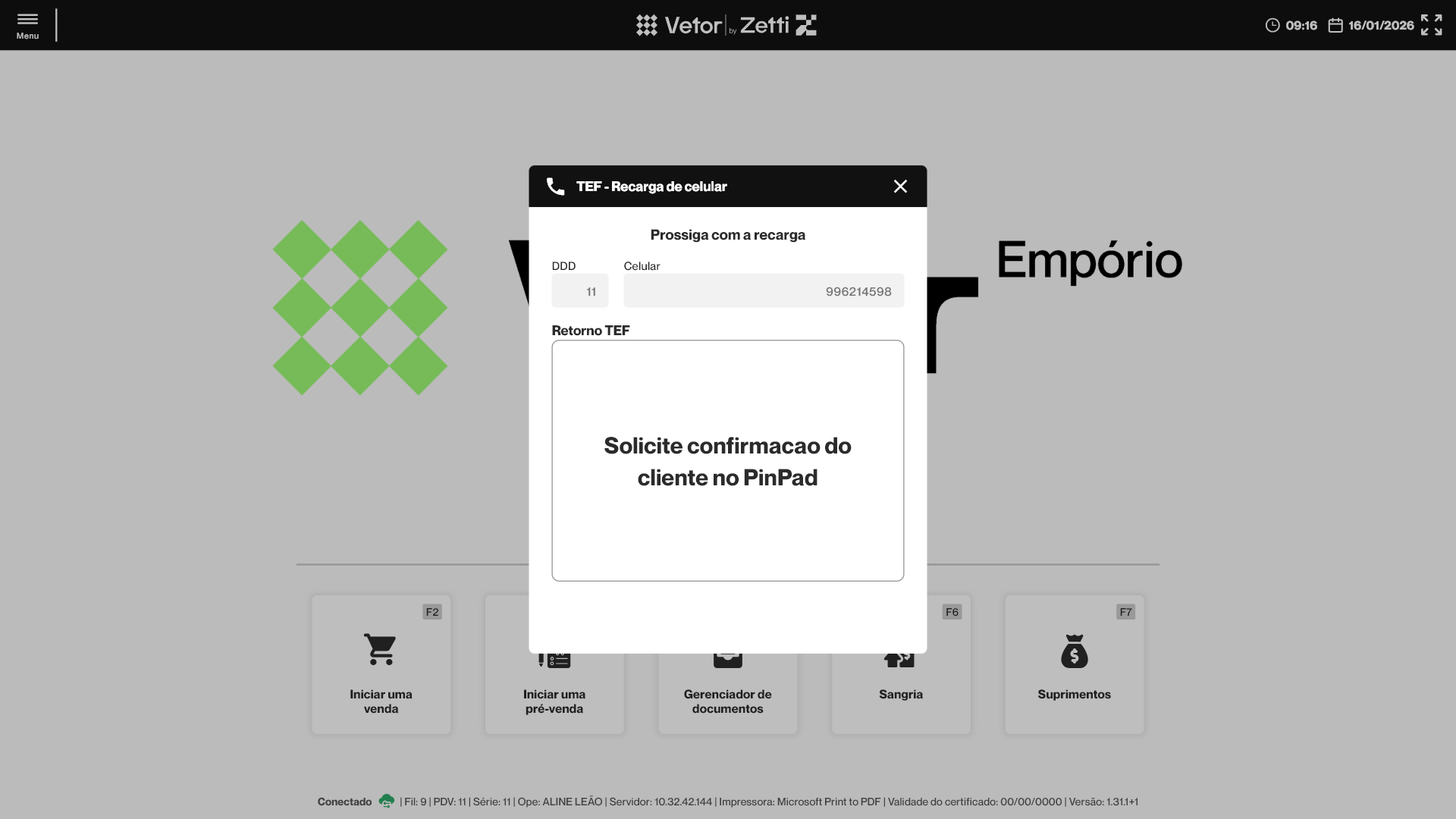 - Para que a operação de recarga seja concluída com sucesso é essencial que o TEF esteja devidamente configurado e ativo no terminal responsável pelo processamento do recebimento, pois o TEF é responsável por realizar a comunicação com a operadora, exibir a confirmação da transação ao cliente no PinPad e validar a conclusão da operação, independentemente da forma de pagamento escolhida. Caso o TEF não esteja ativo ou corretamente configurado, a recarga não poderá ser finalizada, mesmo que o pagamento seja efetuado por outro meio.