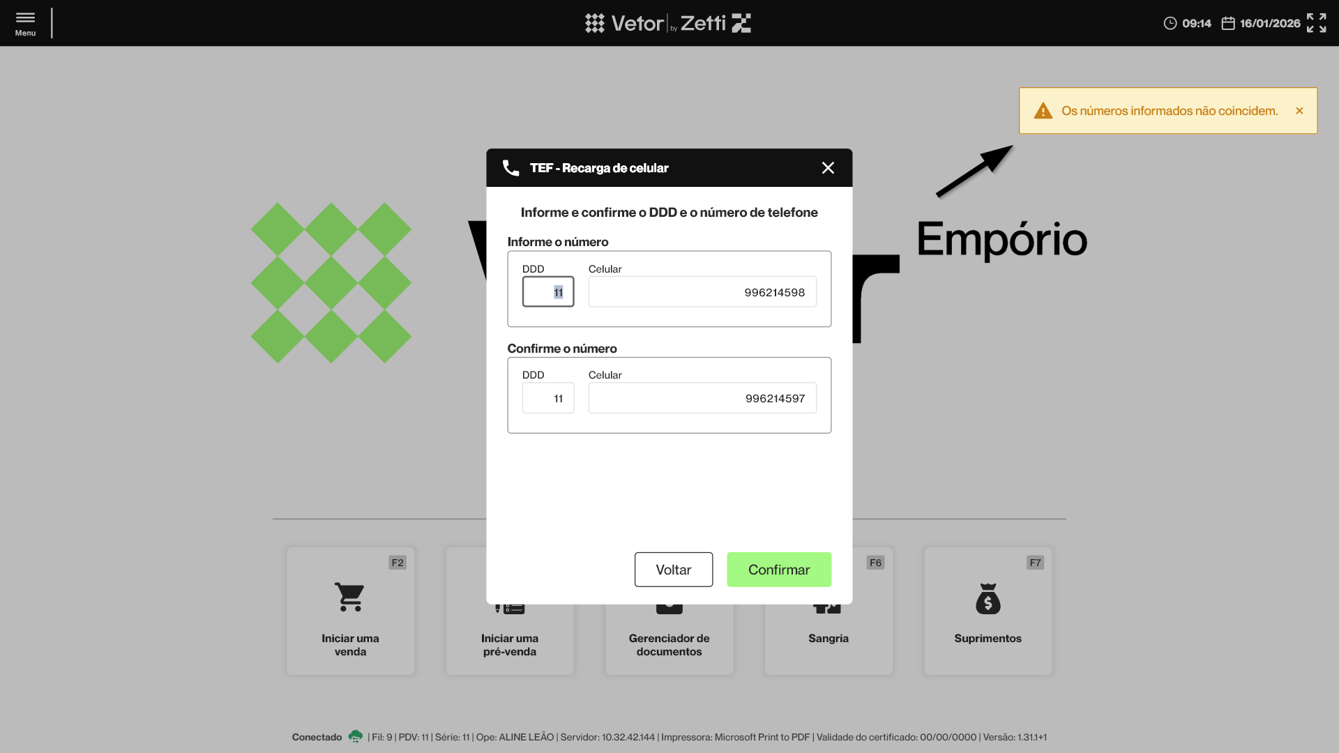 Se o número digitado para confirmação for diferente do informado anteriormente, o sistema exibirá um alerta na tela e impedirá que o operador dê continuidade ao processo.