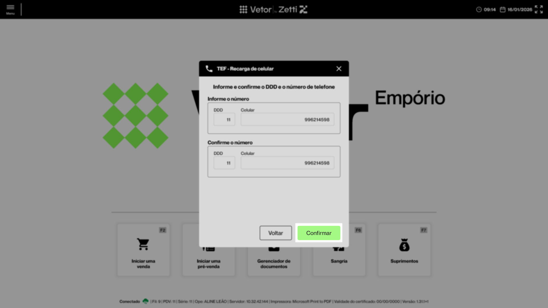 Em seguida, o sistema solicitará a confirmação do cliente no PinPad conectado. As informações da recarga estarão disponíveis na tela do PinPad, incluindo o DDD e o número do cliente, bem como o valor da recarga. Para confirmar a operação, o cliente deverá selecionar a opção de confirmação, geralmente identificada na cor verde. Caso seja necessário cancelar a operação, ele deverá selecionar a opção de anulação, geralmente identificada na cor vermelha. Neste cenário, ele poderá reiniciar o processo de recarga.
