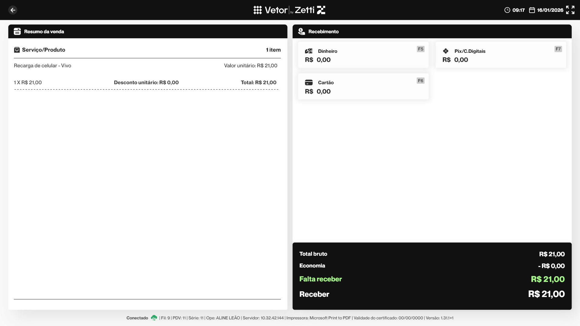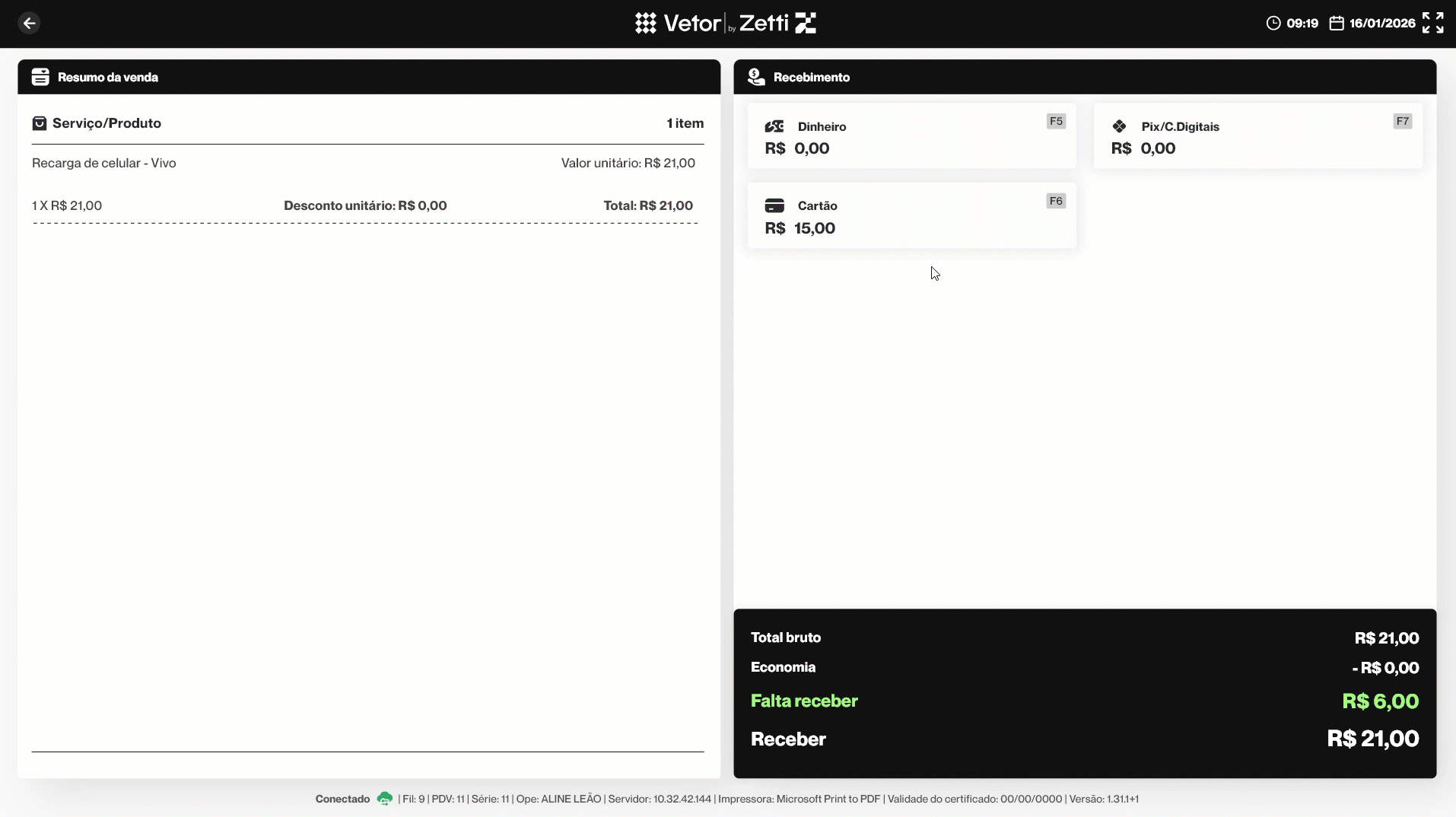 - Recebimento: Refere-se à forma como o valor da venda é pago pelo cliente, como crédito, débito ou outros meios de pagamento disponíveis no sistema.