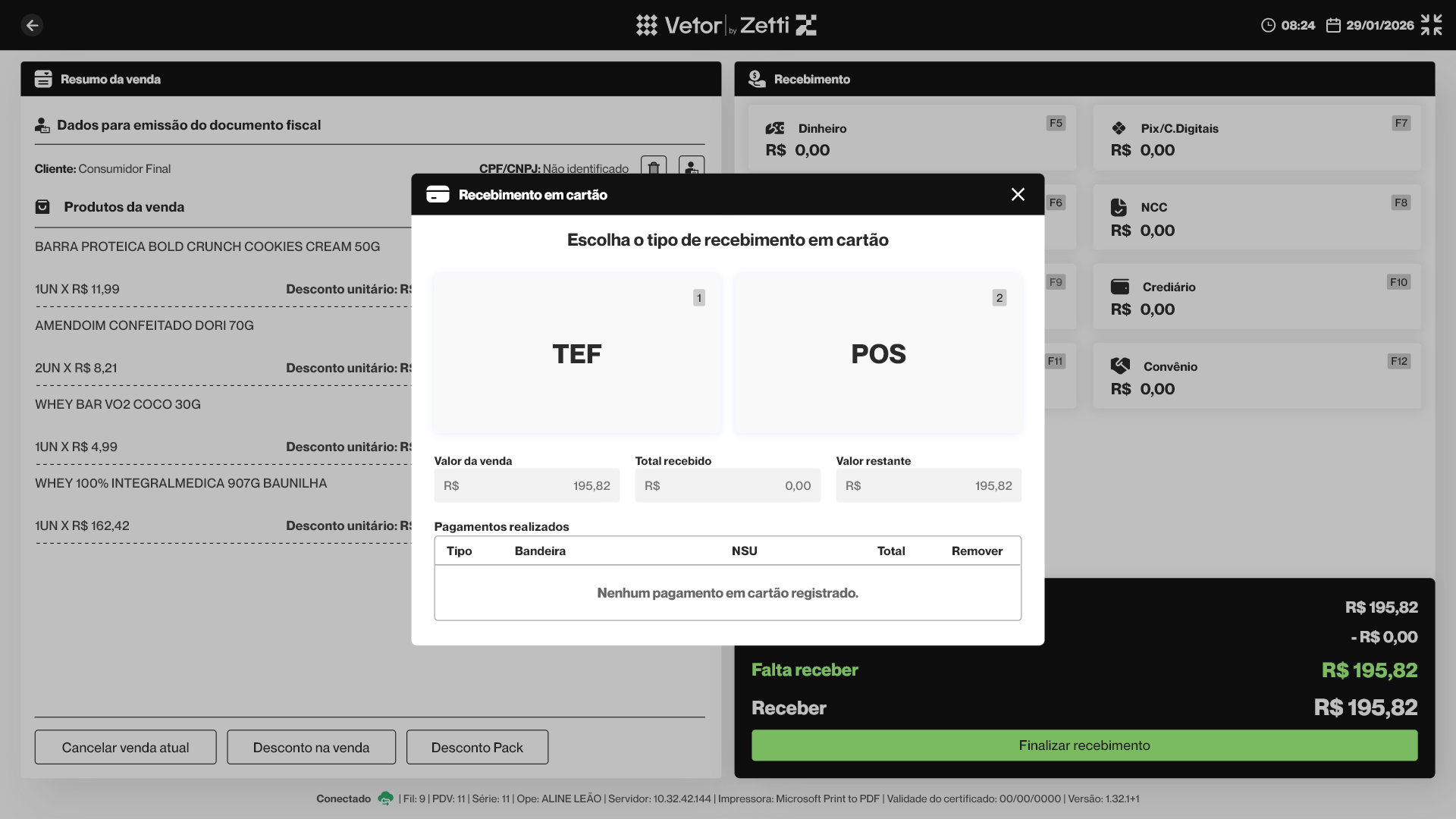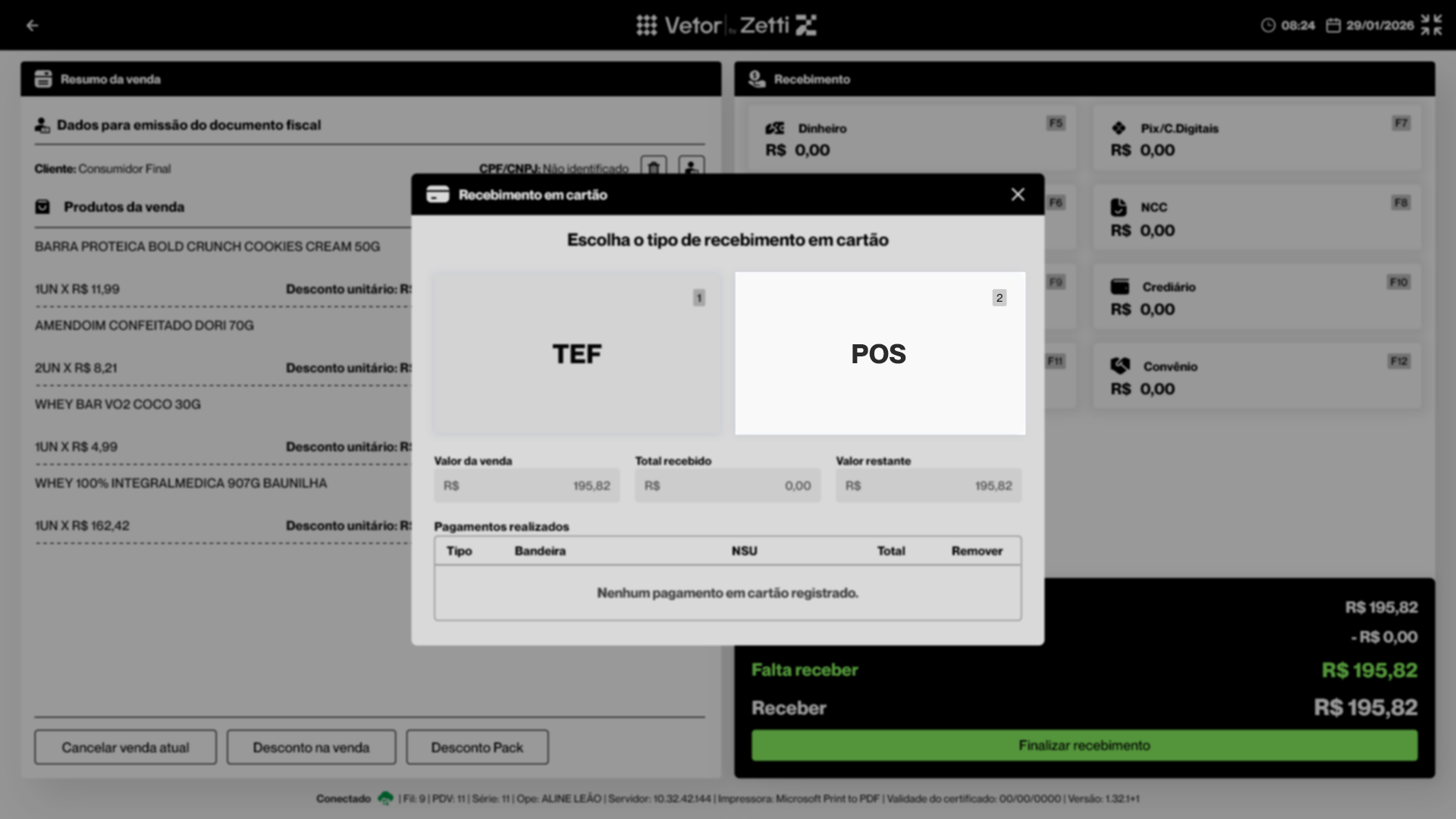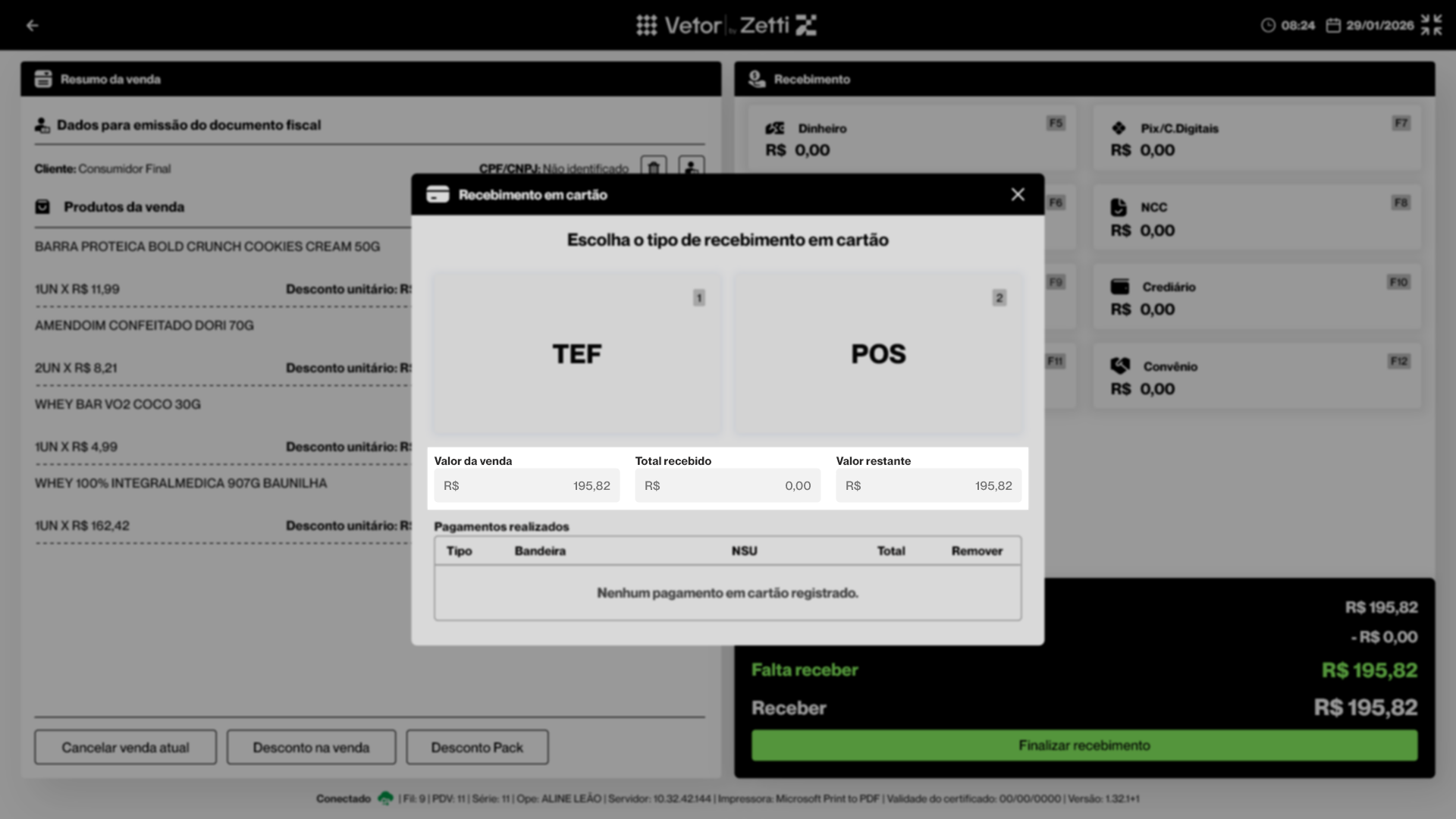 Nesta operação, o operador de caixa aprenderá como finalizar uma venda no PDV utilizando o recebimento por cartão, por meio da integração com o POS (Point of Sale). Esse tipo de pagamento é realizado em um terminal eletrônico que processa transações com cartões de débito, crédito ou pré-pago diretamente no ponto de venda. No PDV Empório, o recebimento por cartão é integrado ao sistema, permitindo o registro e a validação das transações durante o processo de finalização da venda, sem impacto no fluxo operacional do caixa. Confira ao longo deste documento as orientações necessárias para registrar corretamente recebimentos com cartões de débito e crédito, desde a seleção da forma de pagamento até a conclusão da transação.