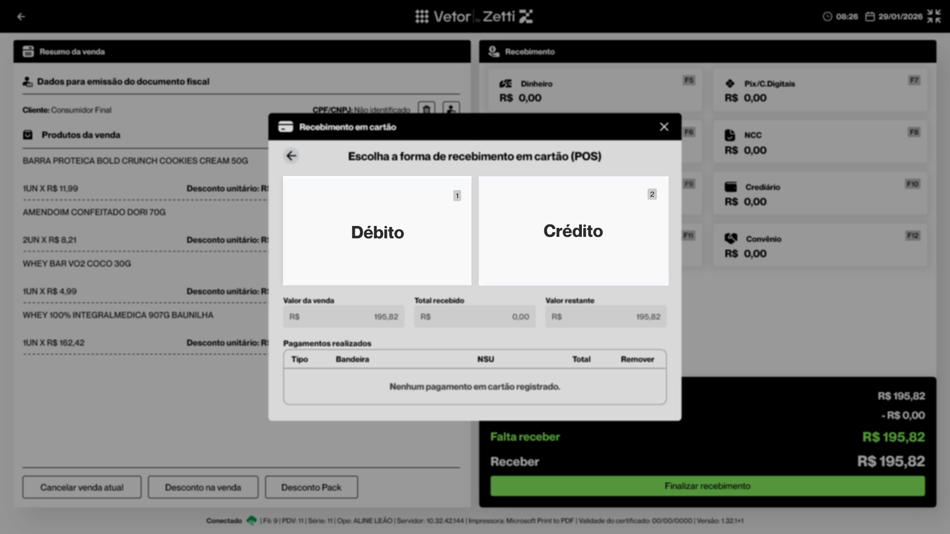 No próximo passo, o operador deverá selecionar a forma de recebimento em cartão, de acordo com a escolha do cliente. As opções são: "Débito" e "Crédito".
