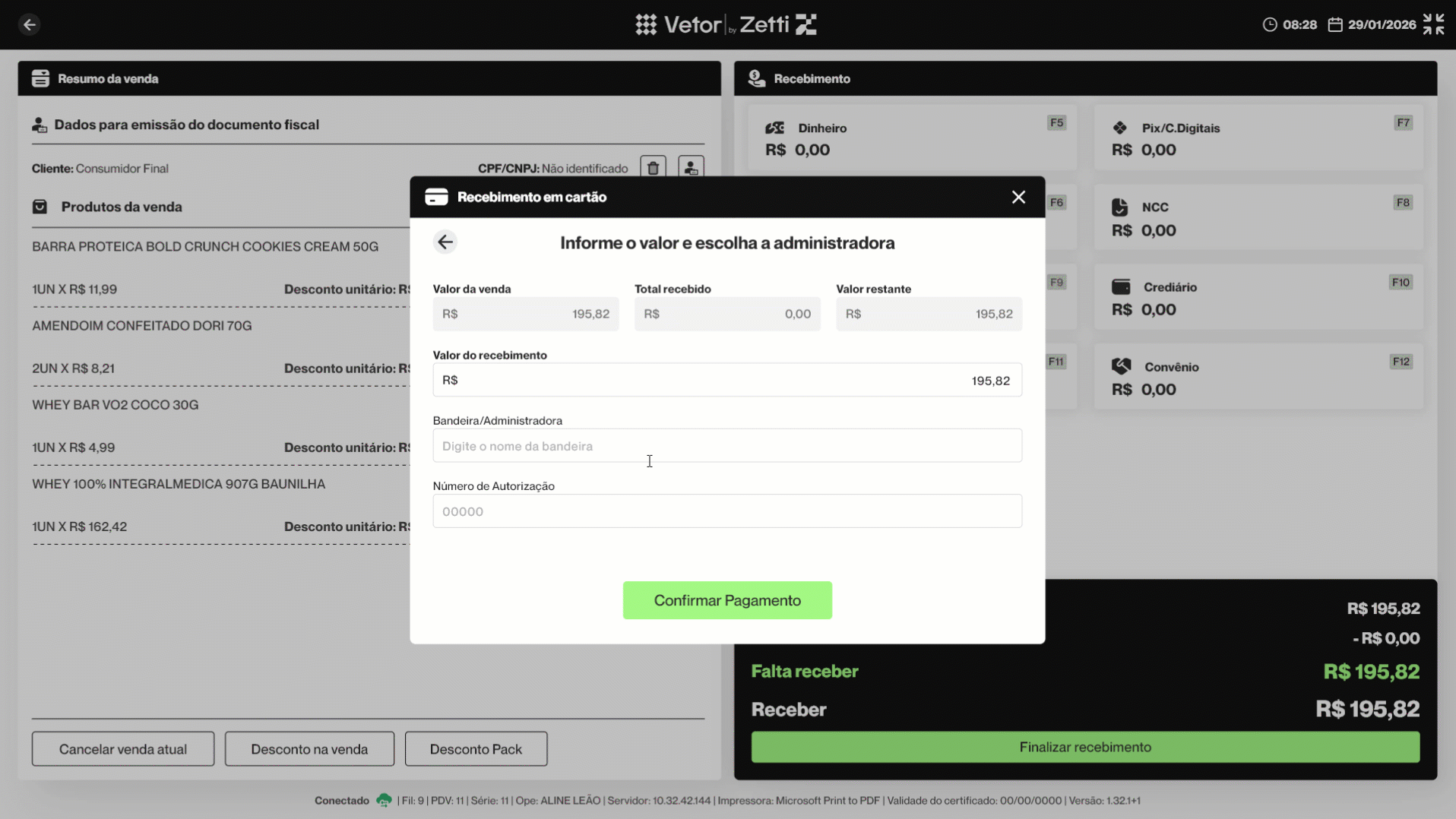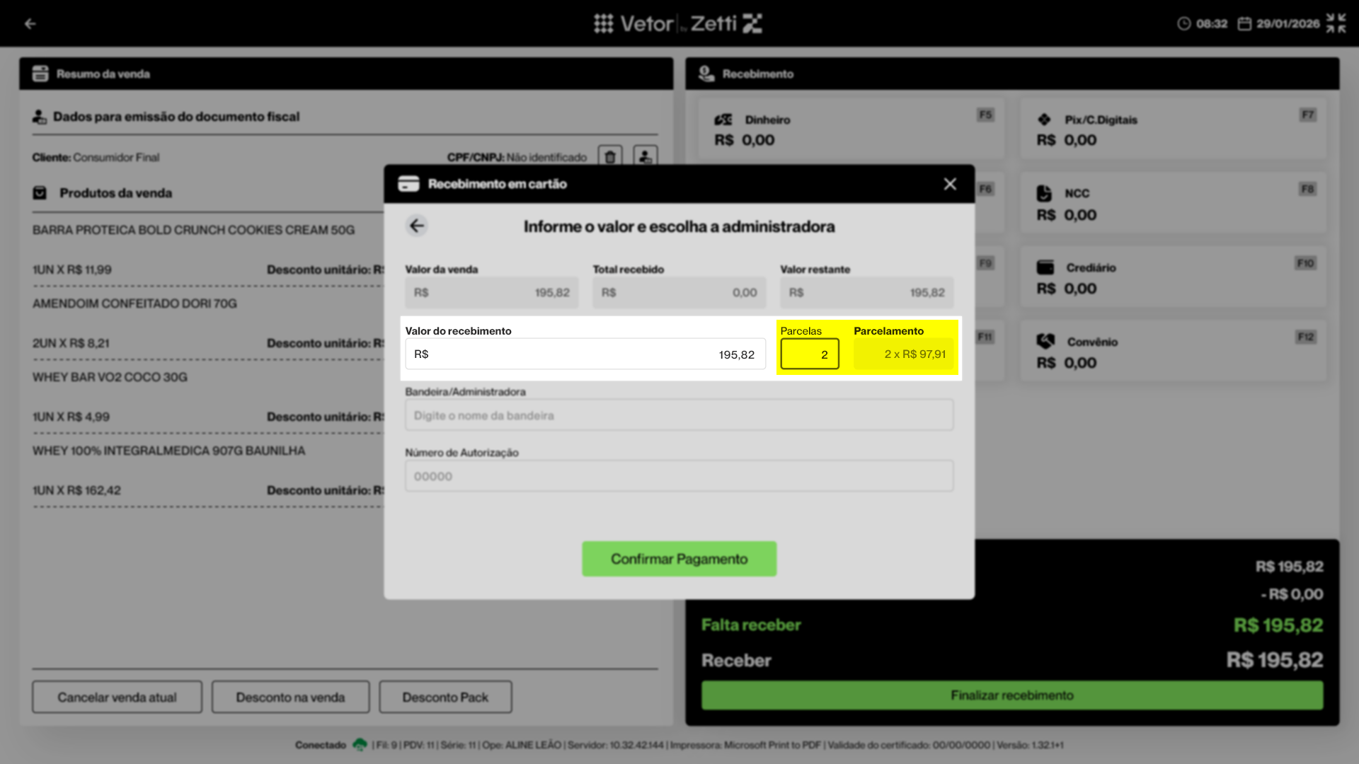 - Após identificar a venda e os produtos que a compõem, clique em >> Finalizar (F2). A seguir, à direita, utilize a seção “Recebimento” para escolher a opção >> Cartão (F6)