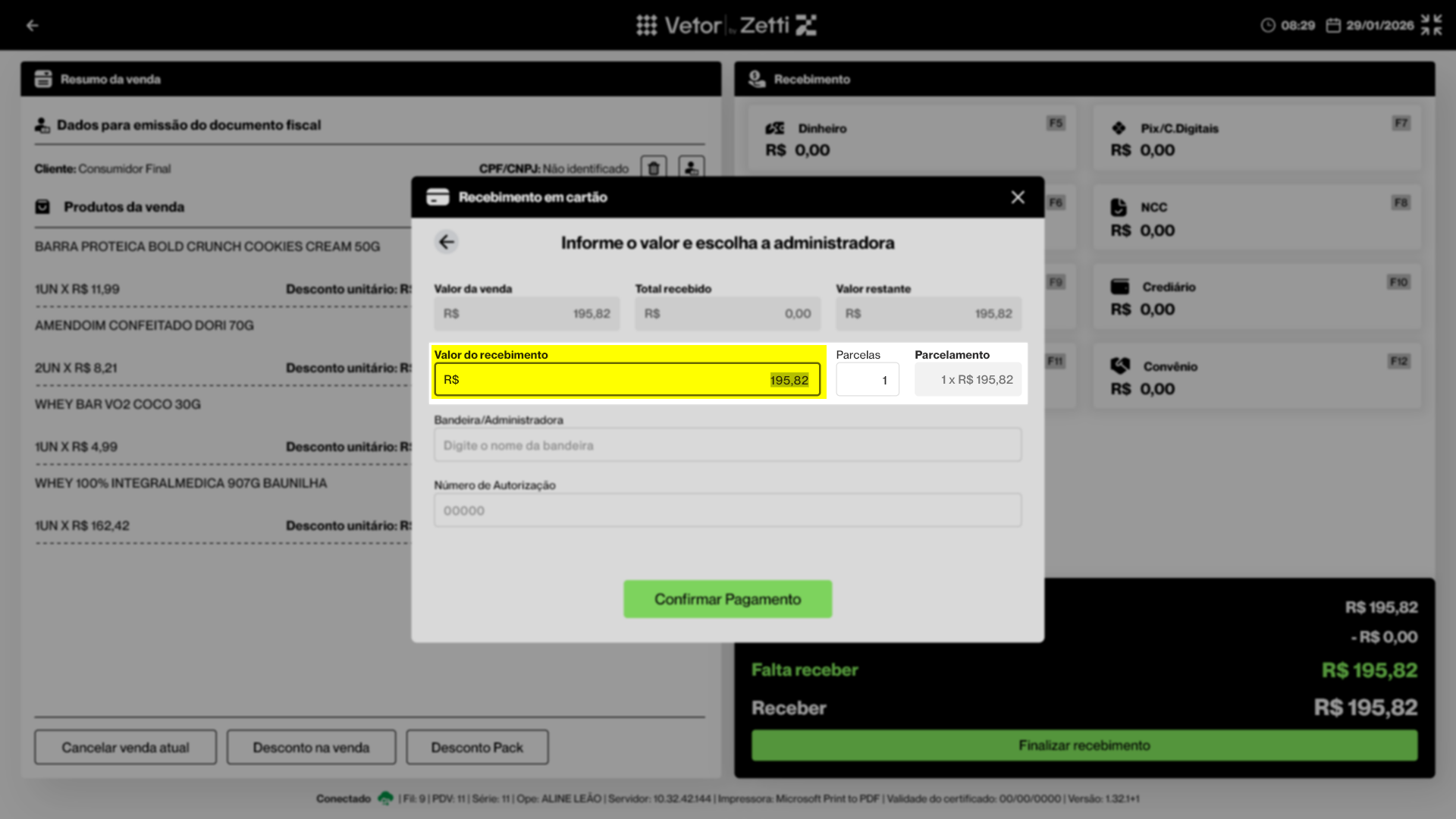 O campo “Valor do recebimento” indica o valor que a loja irá receber do cliente. Por padrão, o sistema sugere o valor pendente: isto é, o valor total se nenhum pagamento anterior tiver sido registrado ou o saldo restante a ser recebido. O operador, no entanto, pode ajustar esse valor conforme necessário, informando o montante efetivamente pago pelo cliente.
