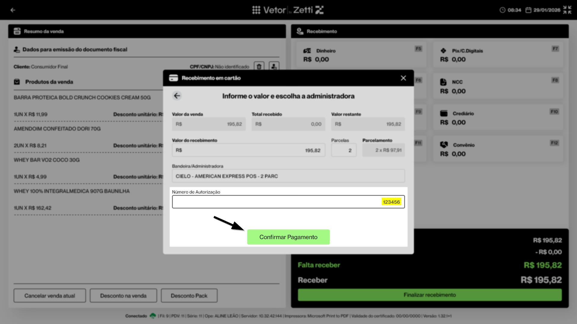 Em seguida, preencha o campo "Número de Autorização" com o código registrado no comprovante emitido pela operadora do cartão. Por fim, clique em >> Confirmar Pagamento para registrar o recebimento via cartão.