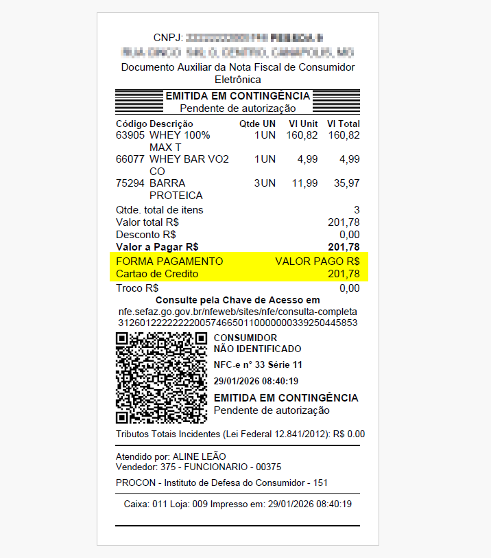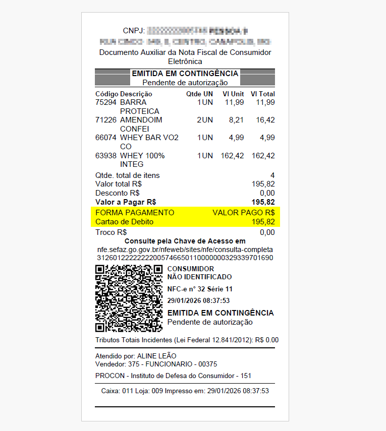 Por outro lado, se não houver valores pendentes, ao processar o pagamento com cartão, o sistema emitirá automaticamente o comprovante da venda. Em seguida, será exibida na tela a informação de que o DANFE foi gerada e o documento estará disponível para consulta no local configurado para armazenamento na máquina.