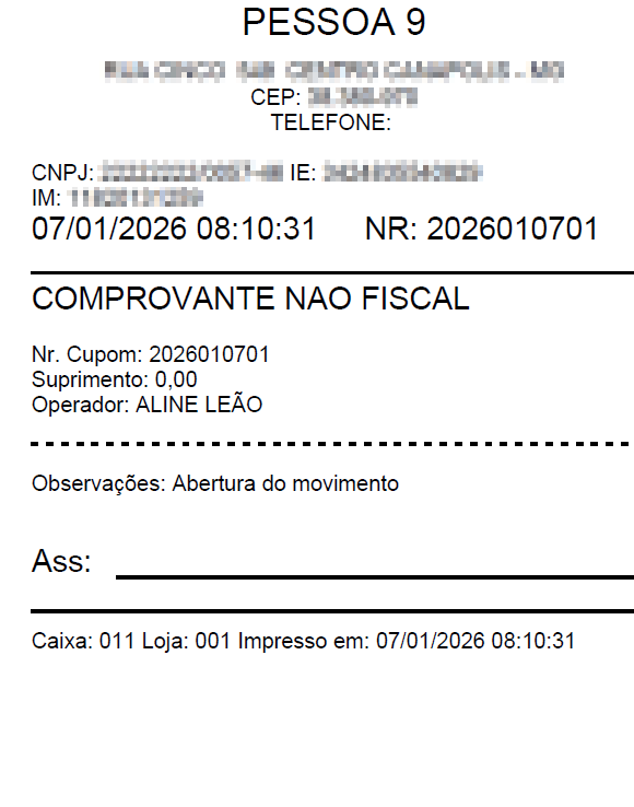 Além disso, após concluir todos os passos anteriores, o comprovante de abertura será gerado automaticamente, conforme a configuração do ponto de venda utilizado. Dependendo dessa configuração, o comprovante pode ser impresso diretamente, caso haja uma impressora configurada, ou salvo na pasta designada. Veja a seguir um exemplo do comprovante gerado, conforme as opções de configuração: