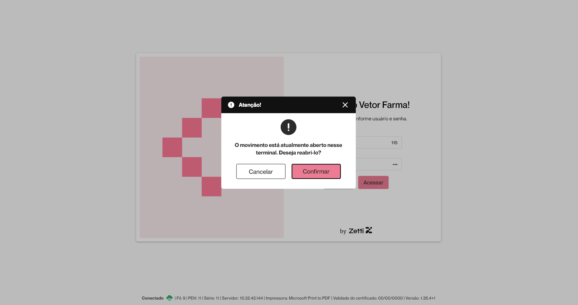 No momento do login, caso o operador já tenha iniciado um movimento anteriormente e tenha fechado o PDV sem realizar o fechamento do movimento, o sistema exibirá a seguinte mensagem: "O movimento está atualmente aberto nesse terminal. Deseja reabri-lo?" Essa mensagem indica que já existe um movimento em aberto vinculado ao mesmo operador e ao mesmo terminal, e que o tempo de permanência do movimento ainda está vigente. Ao clicar em >> Confirmar, o sistema reabrirá o movimento existente, permitindo que o operador dê continuidade às suas atividades normalmente.