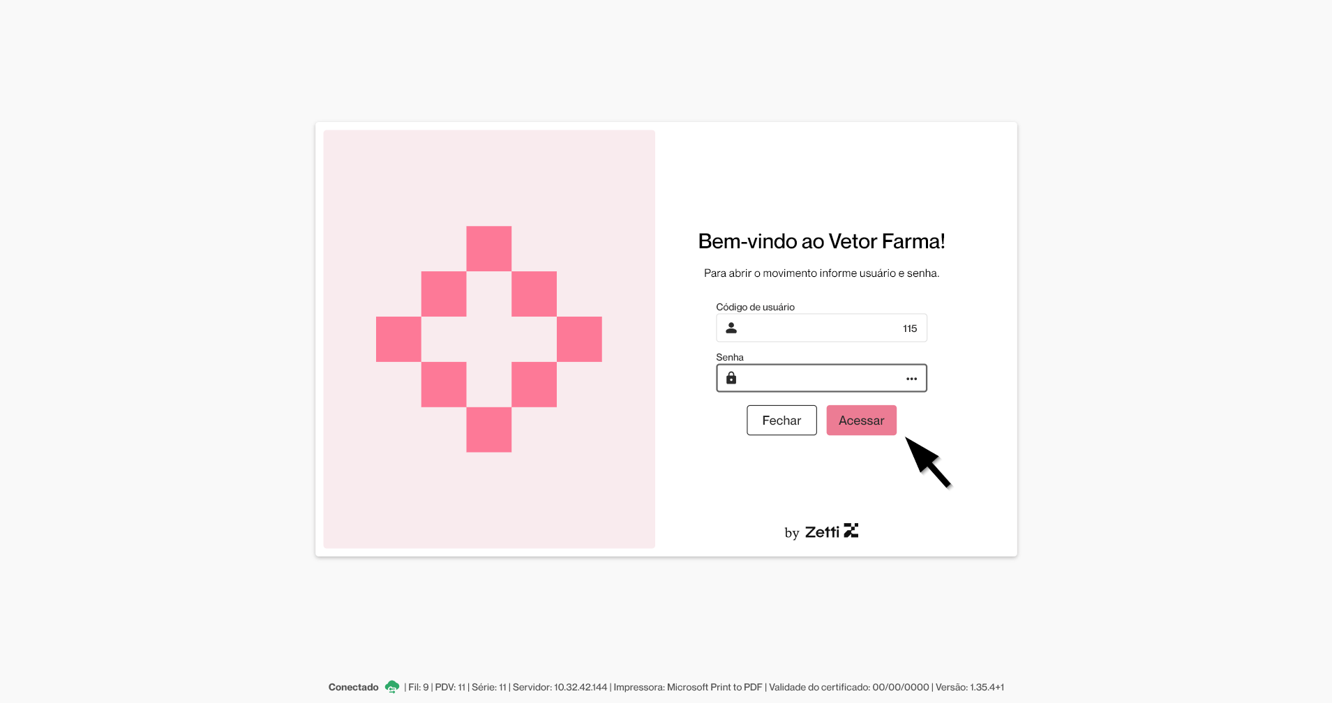 • Autenticação: Processo de validação do operador no sistema, realizado por meio de credenciais de acesso (nesse caso, código do operador e senha), que permite iniciar ou dar continuidade às operações no PDV.