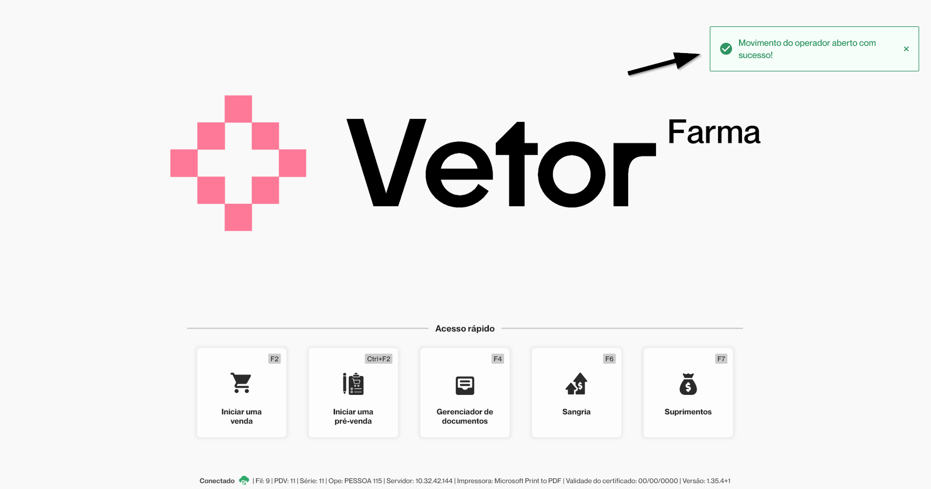 Após informar, se necessário, o valor do fundo de troco, a abertura do movimento será efetuada, permitindo que o caixa inicie as operações. Veja que uma mensagem de confirmação é exibida na tela inicial: