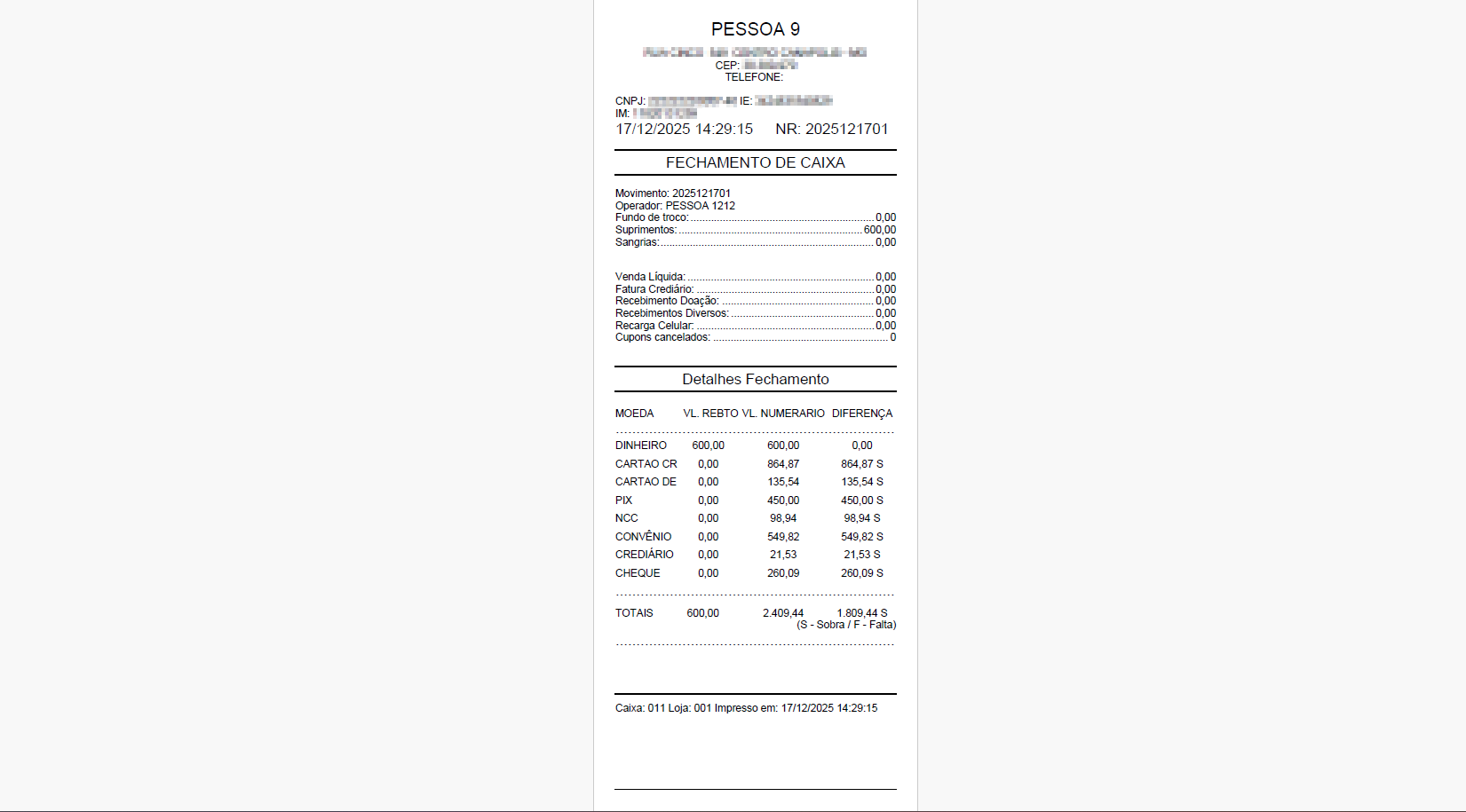 - Suprimentos: Registro de valores adicionados ao caixa durante o expediente, normalmente para reforço de troco ou ajuste de saldo, garantindo que o caixa possua recursos suficientes para a operação;