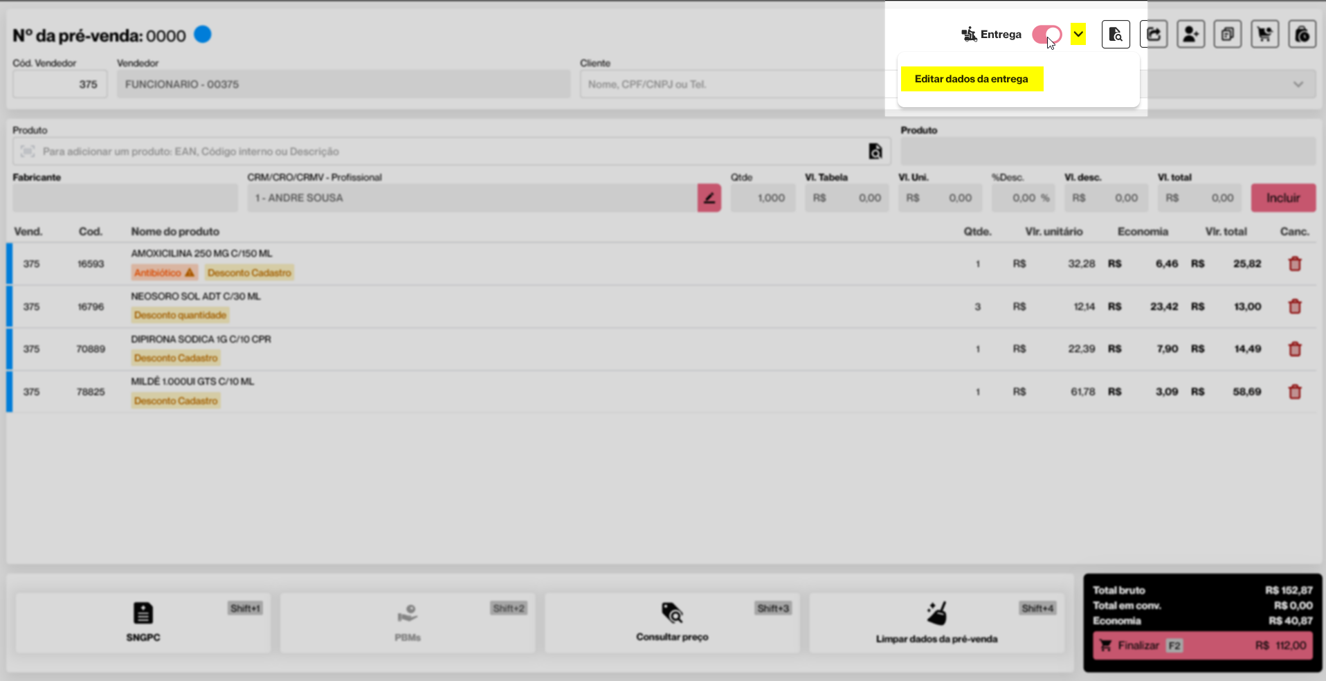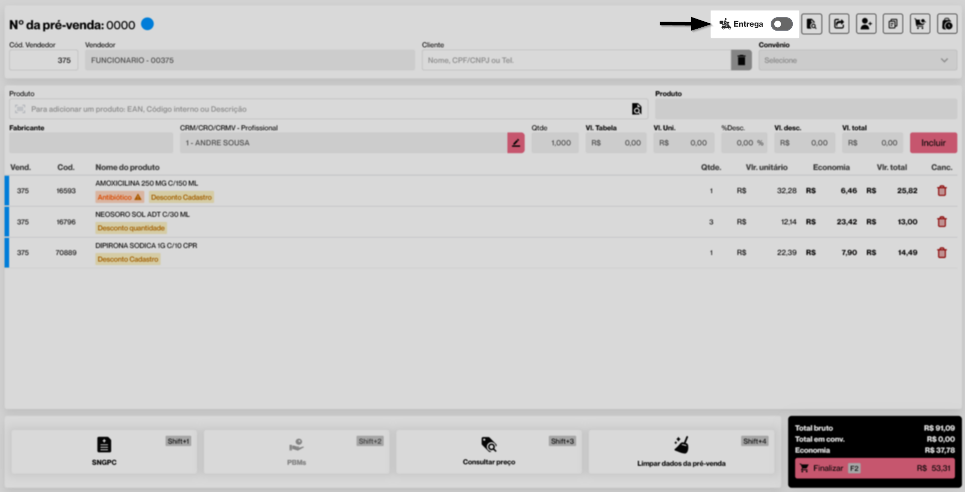 Após iniciar a pré-venda e incluir os produtos desejados, se for do interesse, o operador poderá ativar a opção de entrega. Dessa forma, ao finalizar a venda, a entrega já estará associada ao pedido. Para isso, ative a opção "Entrega", disponível no canto superior direito da tela.
