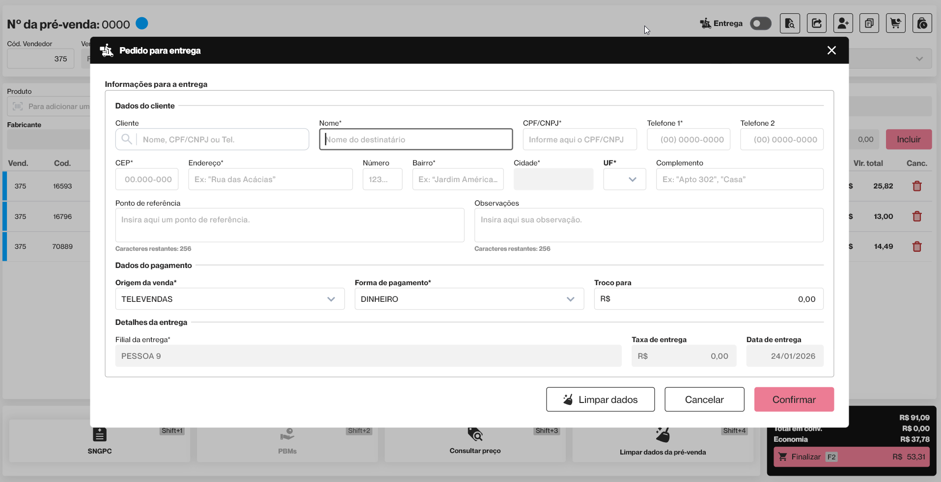 Esta operação permite ao operador ativar a entrega de um pedido durante a pré-venda no PDV Farma, garantindo que a venda já esteja associada ao serviço de entrega ao final do processo. Por meio dessa funcionalidade, o vendedor registra os dados do destinatário, endereço de entrega, forma de pagamento, taxa de entrega (quando aplicável) e data prevista, assegurando que todas as informações necessárias estejam corretas para a logística da entrega durante a finalização do pedido.