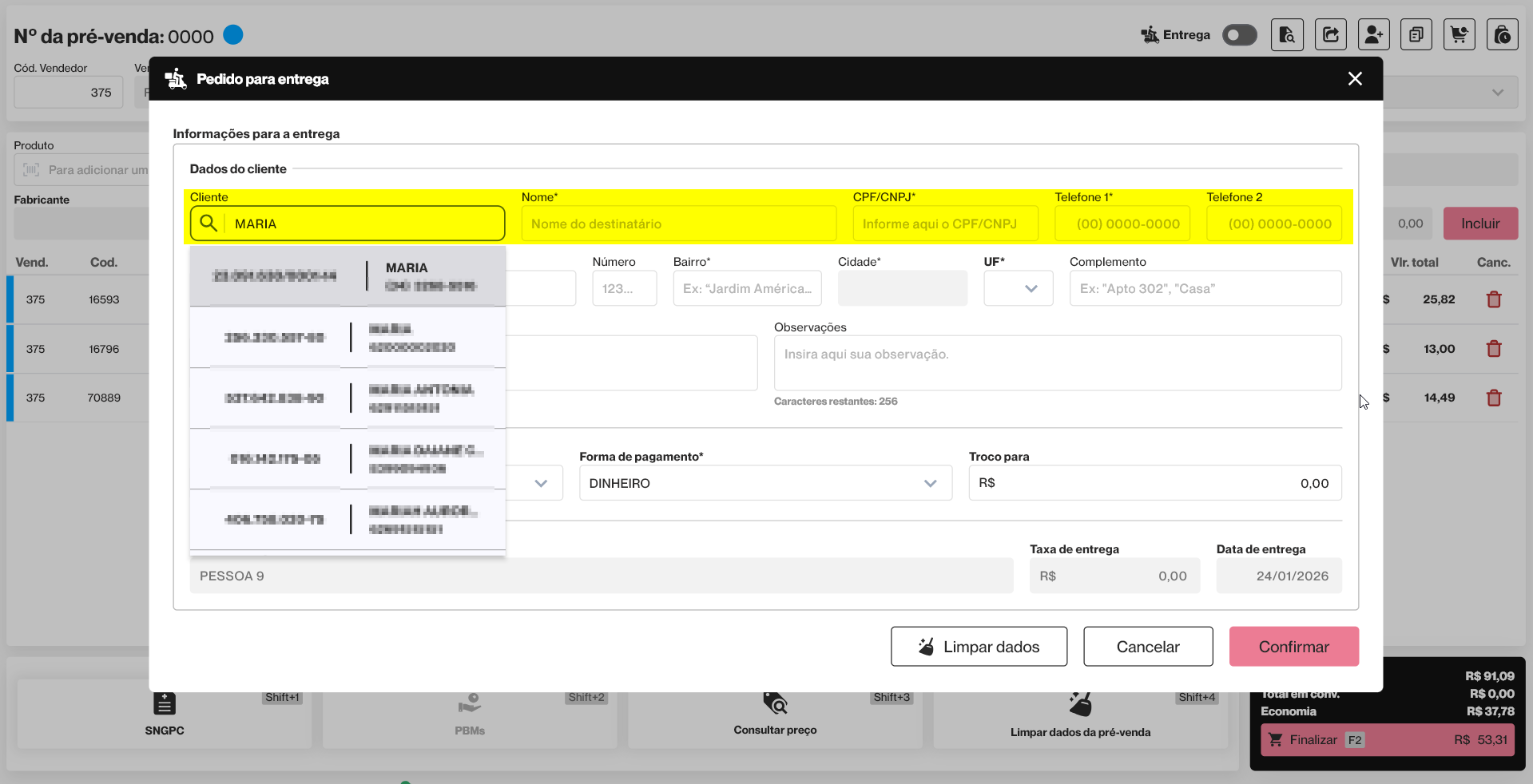 Na seção "Informações para a entrega", o operador deverá informar os dados pessoais da pessoa que receberá o pedido, como nome, CPF/CNPJ e telefones para contato. Caso o cliente tenha cadastro na loja, ao preencher o campo "Cliente", uma lista com os nomes semelhantes será revelada, permitindo a seleção.